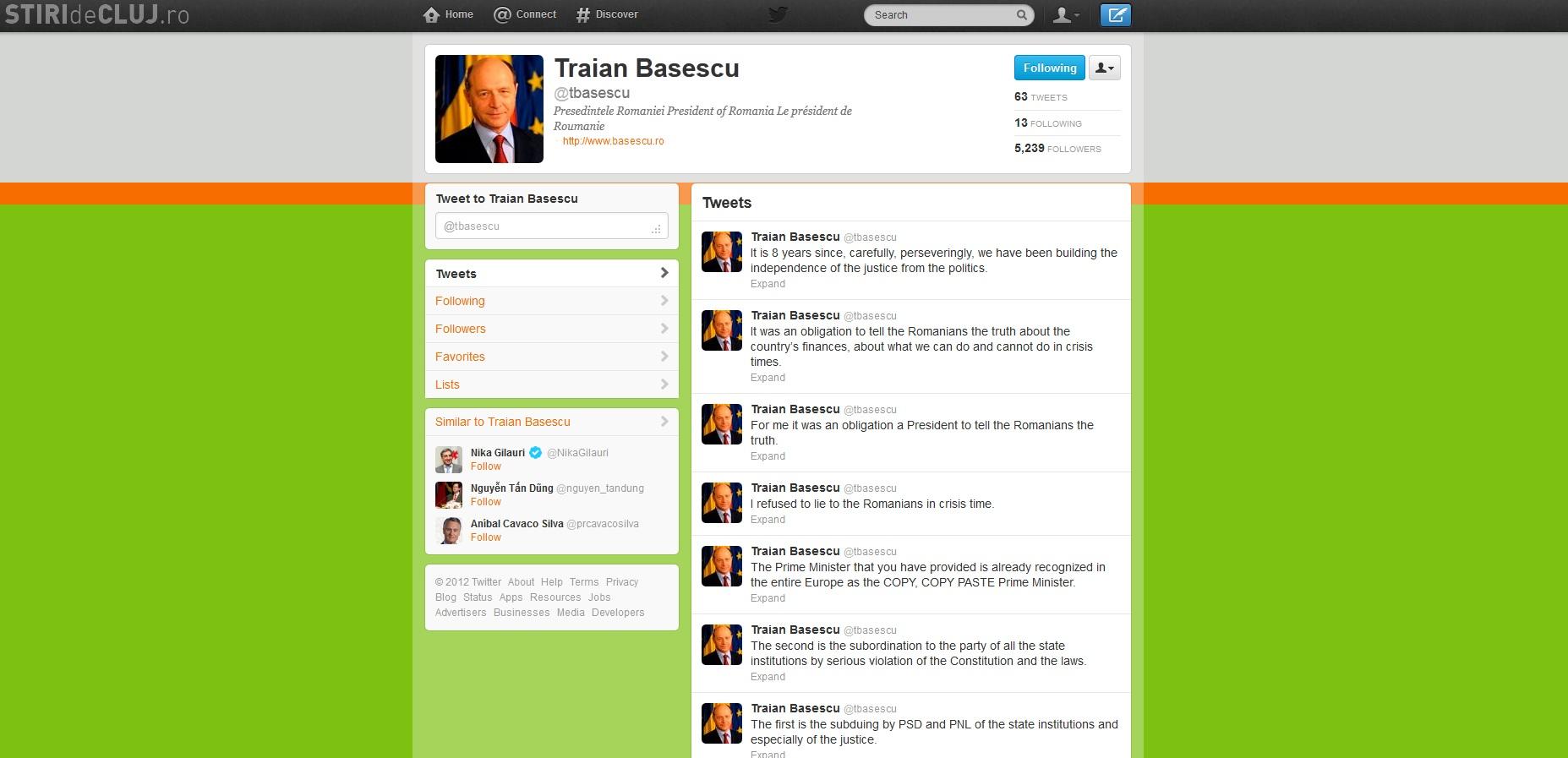 Preşedintele Traian Băsescu este activ pe Twitter, postând și în engleză diverse reacții legate de posibila lui suspendare.