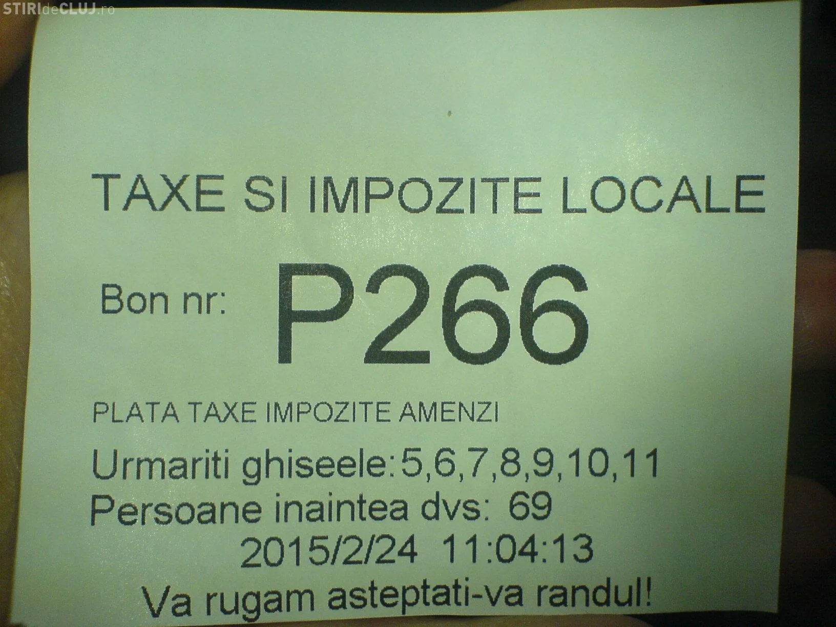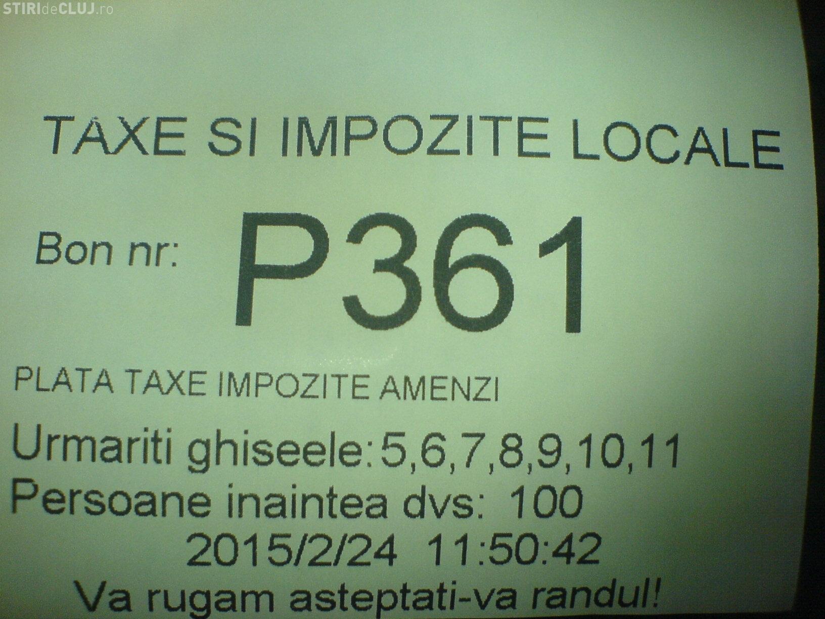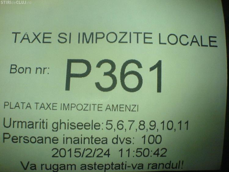 ”Am facut observatiile de mai jos in data de 24 februarie: 1. Durata medie de asteptare a fost de 1 ora pentru plata impozitului; 2. Biletul de ordine preciza ca numarul de persoane aflate la rand inainte este intre 69 si 100! (v. poze atasate); 3. Ghiseele 4, 8 si 10 au fost inchise permanent; 4. O persoana in varsta a lesinat pe durata asteptarii din cauza ca incaperea este neaerisita (si din cauza afectiunilor varstei). Niciun angajat al insitutiei nu a intervenit in ajutor; 5. Pe durata asteptarii am sunat la "Alo, domnul primar" si desi doamna a fost amabila, nu a putut sa ma ajute cu nimic. A dat niste telefoane si rezultatul a fost ca s-a deschis ghiseul 8 care fusese in pauza, dar s-a inchis ghiseul 5, care a ramas inchis pentru mai multe ore! Astfel ca impozitul se platea la 2-3-4 ghisee. Doamna m-a informat ca multi inspectori sunt in concediu medical: 6. Doamnele de la ghisee ar putea vorbi mai respectuos, mai ales cu persoanele in varsta”, a relatat un clujean.