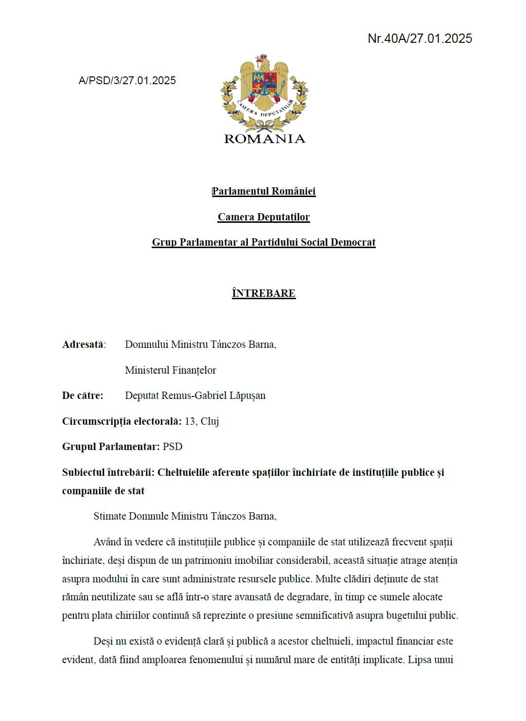 Totul a pornit de la o întrebare pe care deputatul clujean i-a adresat-o ministrului Finanțelor, Tanczos Barna, privind cheltuielile efectuate de instituțiile publice și companiile de stat pentru spațiile închiriate.