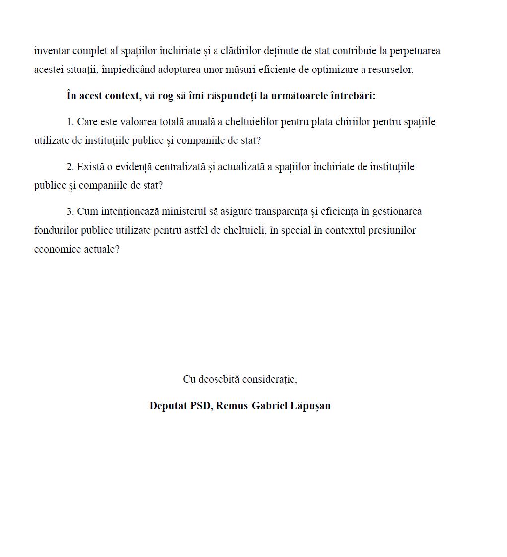 Întrebarea sa a vizat și nivelul de transparență privind contractele de închiriere. Ministerul Finanțelor a menționat că nu are atribuții în publicarea acestor informații – responsabilitatea aparține ordonatorilor principali de credite.