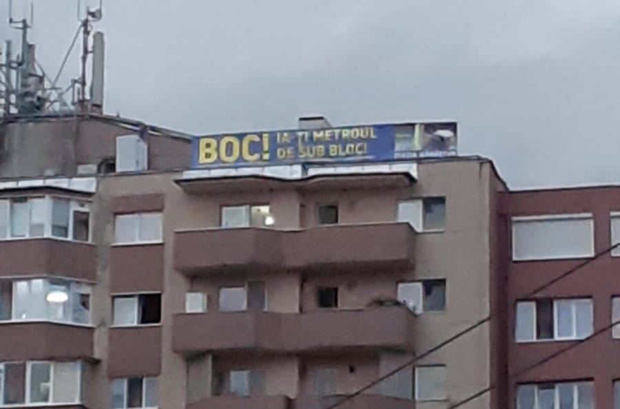 „Boc! Ia-ți metroul de sub bloc!”. Banner de 10 metri amplasat pe un bloc din Mănăștur în ziua inaugurării cu fast a proiectului Metroului Cluj