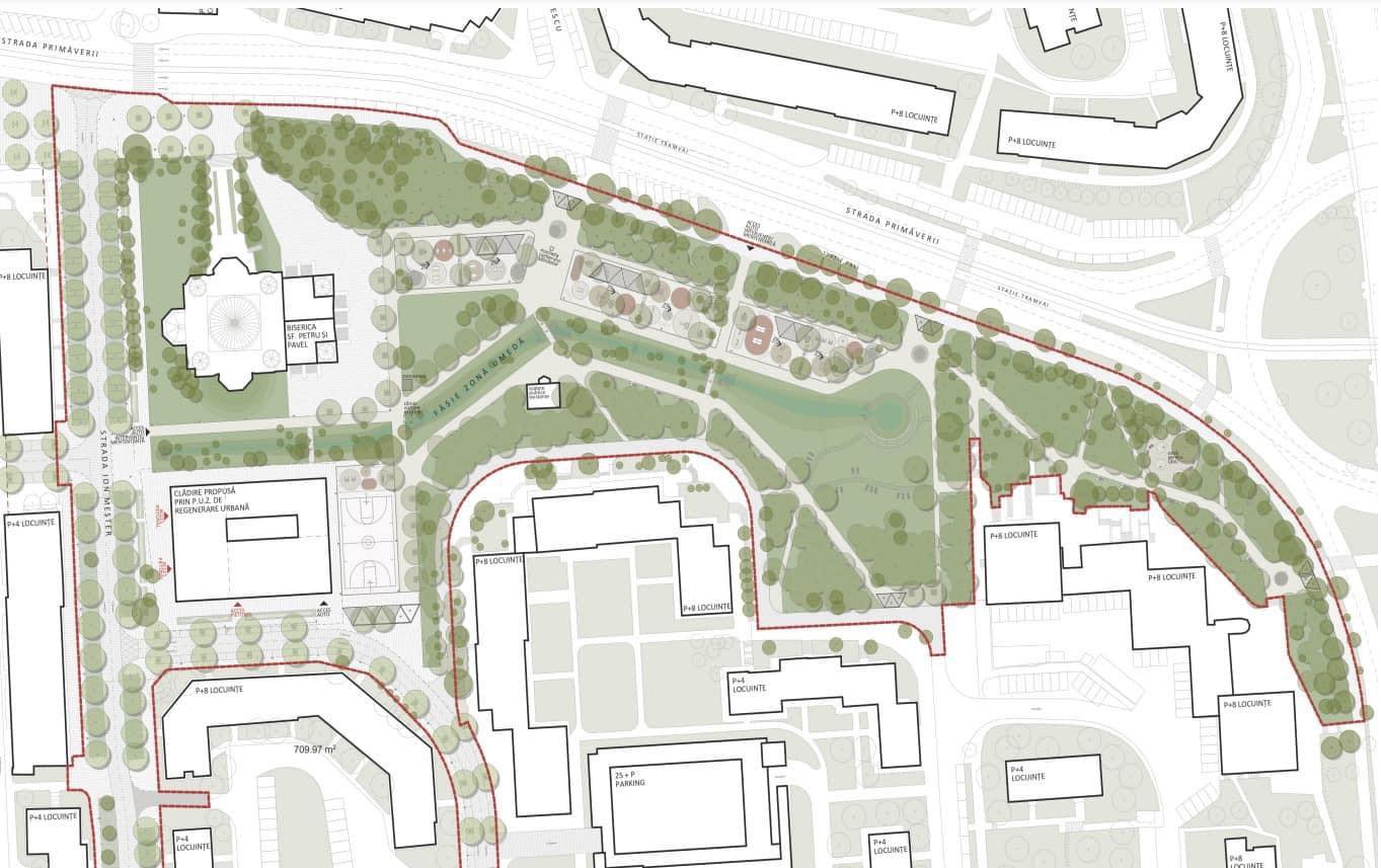 - zona adiacentă parcului, între spațiul verde al parcului și clădirile de locuințe colective - 8075 mp