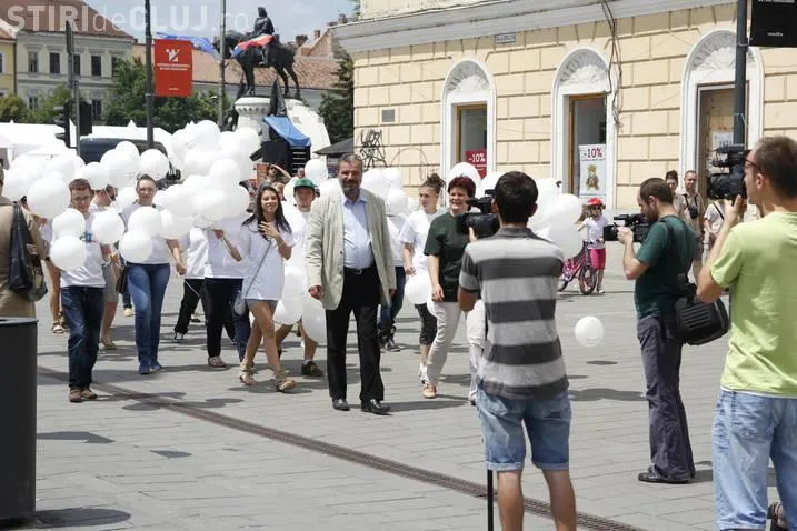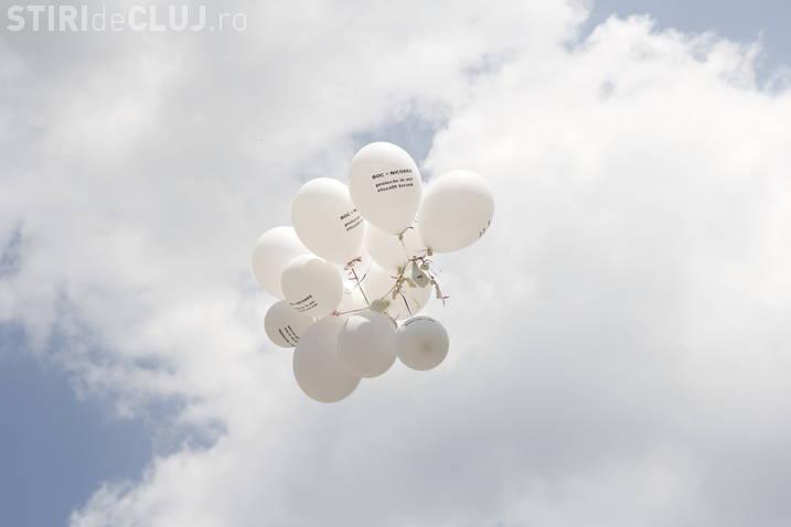 Cateva zeci de baloane cu inscriptia "Boc=Nicoara. Proiecte in aer" au fost lansate de pe Bulevardul Eroilor din Cluj, din fata sediilor judetene ale PDL, PNL si PSD.