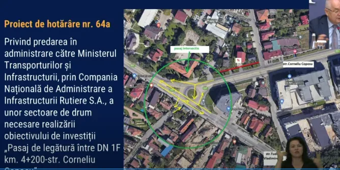 ”În partea cu galben aveți strada Tudor Vladimirescu, care se continuă în Cluj cu Calea Baciului, și avem intersecția cu Corneliu Coposu și cu strada Școlii. Acolo este un sens giratoriu și un blocaj imens.