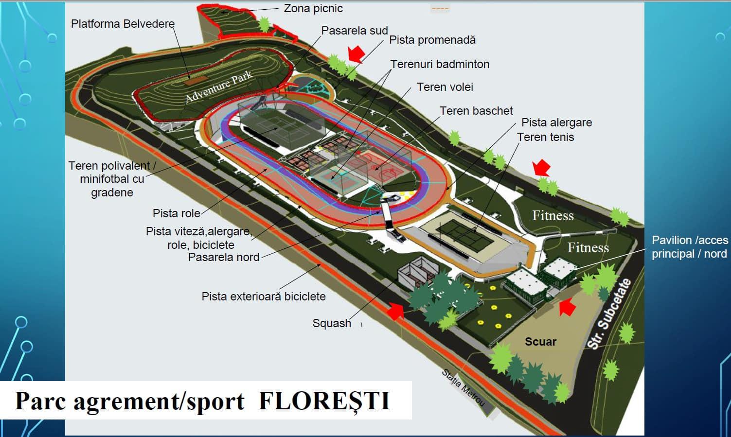 Parcul va fi edificat pe o suprafață de peste 41.000 de metri pătrați şi va costa 23,7 milioane de lei. Proiectul va aduce comunității noi modalități de petrecere a timpului liber pe terenuri de tenis, volei, minifotbal sau badminton, piste de alergare sau pentru plimbări cu rolele, zonă de fitness și spații verzi”, a spus primarul Bogdan Pivariu, după ședința Consiliului Local Florești, de joi, 28 aprilie.