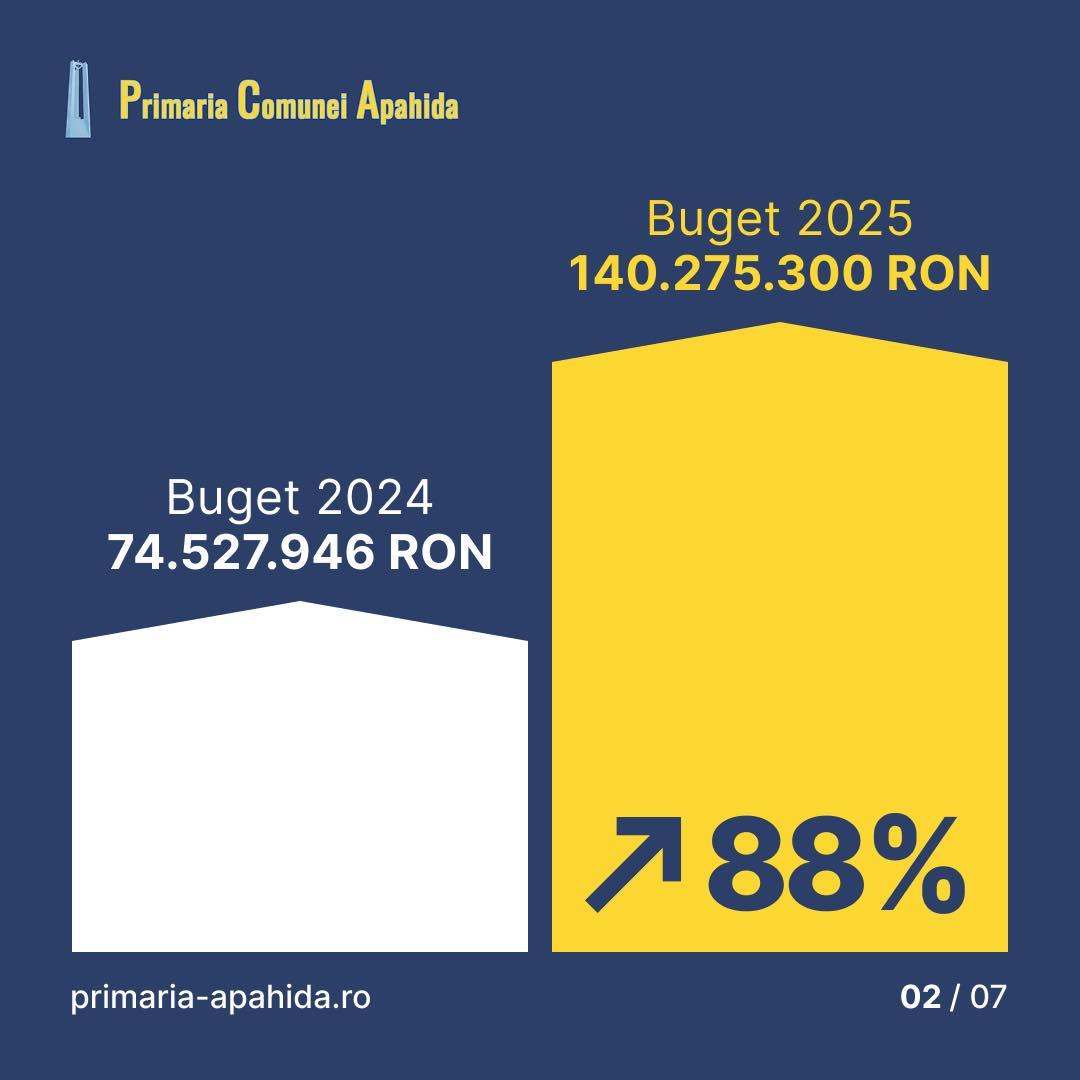 „Buget record pentru Apahida în 2025! Propunerea pentru bugetul anului 2025 este de 140.275.300 RON, ceea ce reprezintă o creștere de 88% față de bugetul anului 2024, care a fost de 74.527.946 RON!