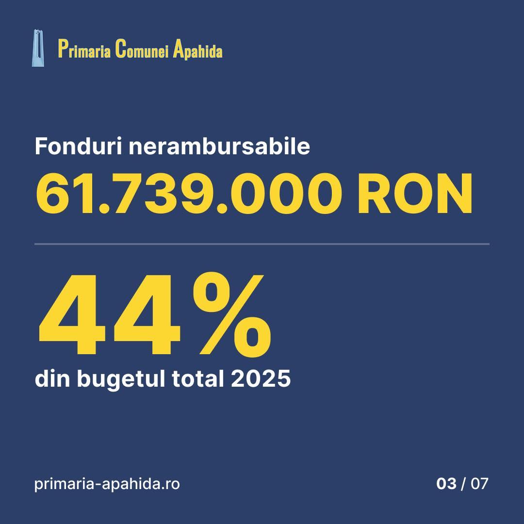 Anul 2025 aduce o sumă record de 61.739.000 RON din fonduri nerambursabile, ceea ce reprezintă 44% din bugetul total! Investițiile în infrastructură, educație și mediu sunt priorități esențiale pentru a asigura o dezvoltare sustenabilă și o calitate mai bună a vieții în Apahida.
