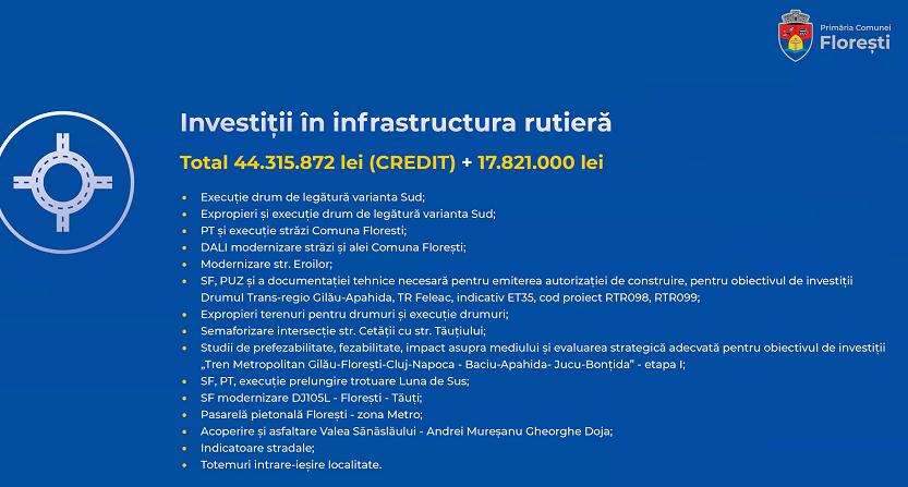 De asemenea, avem în vedere realizarea unui studiu de trafic. Modernizarea DJ 105, care leagă satul Florești de satul Tăuți, realizarea pasarelei pietonale în zona Metro”, a spus primarul Bogdan Pivariu.