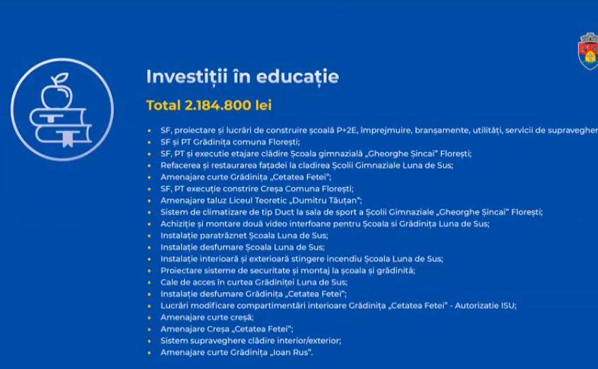 ”Am alocat 2 milioane de lei pentru educație, o sumă destul de importantă. Vorbim aici despre studii de fezabilitate, proiectare și execuție pentru o nouă școală în Florești, pentru o nouă grădiniță.