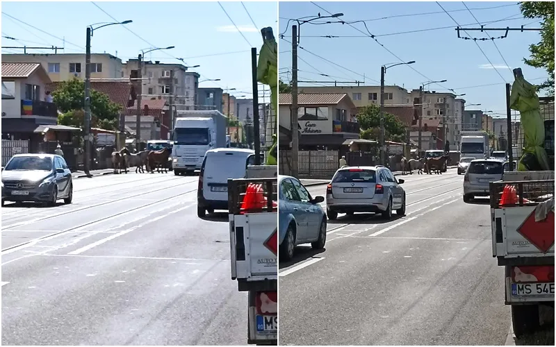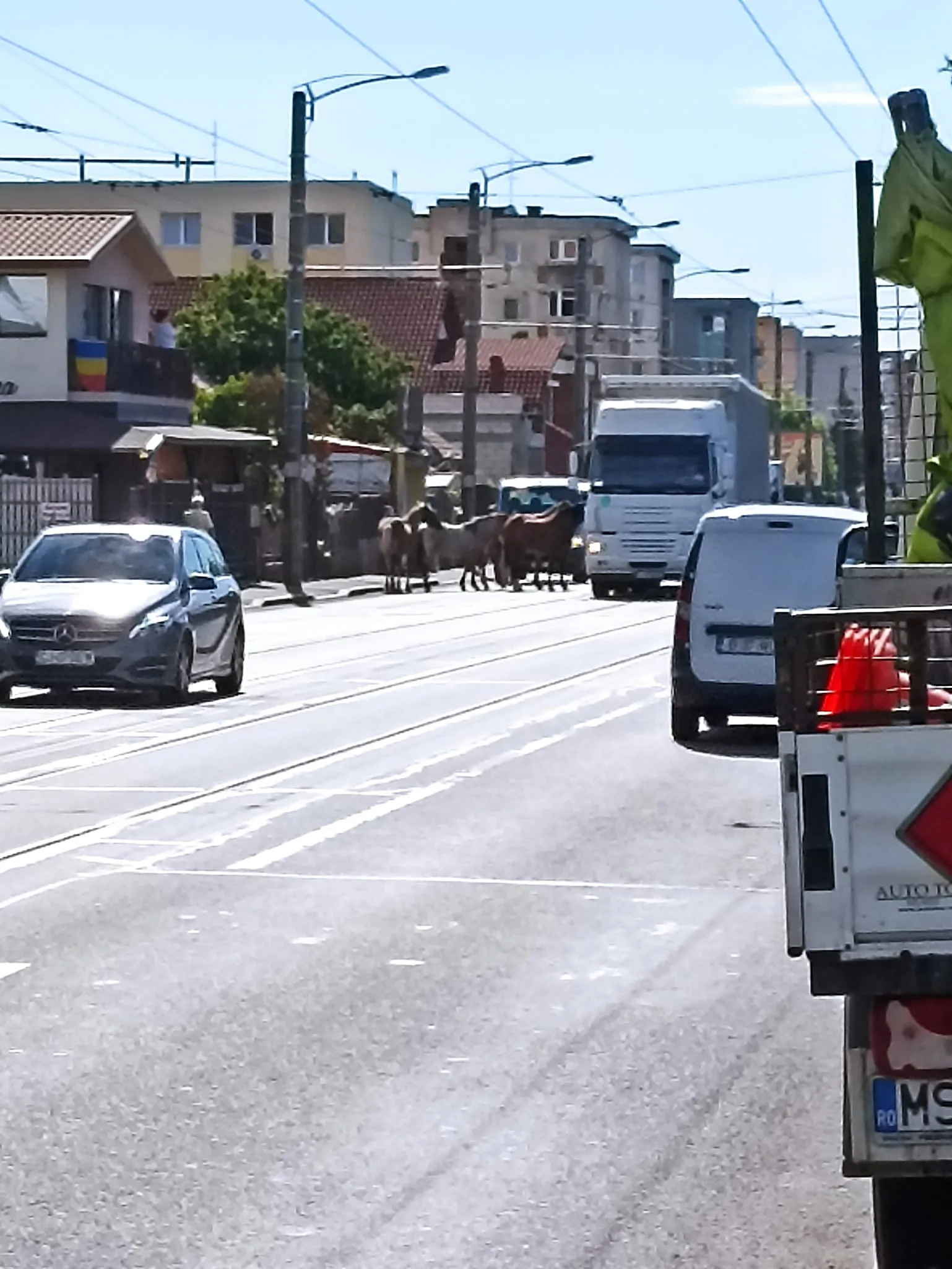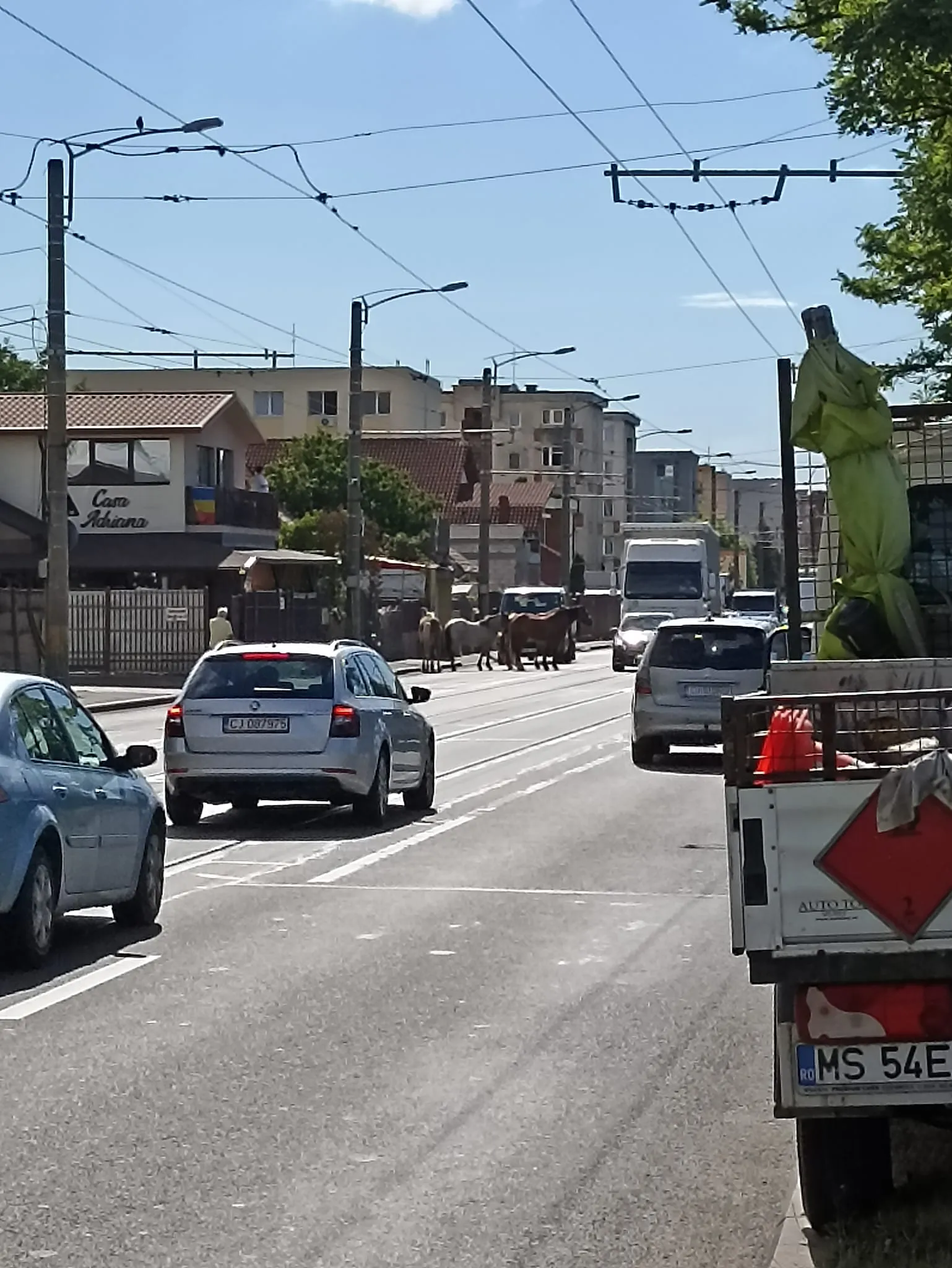 Mai mulți cai au fost fotografiați, marți dimineața, în timp ce circulau liberi printre mașini pe Bulevardul Muncii.