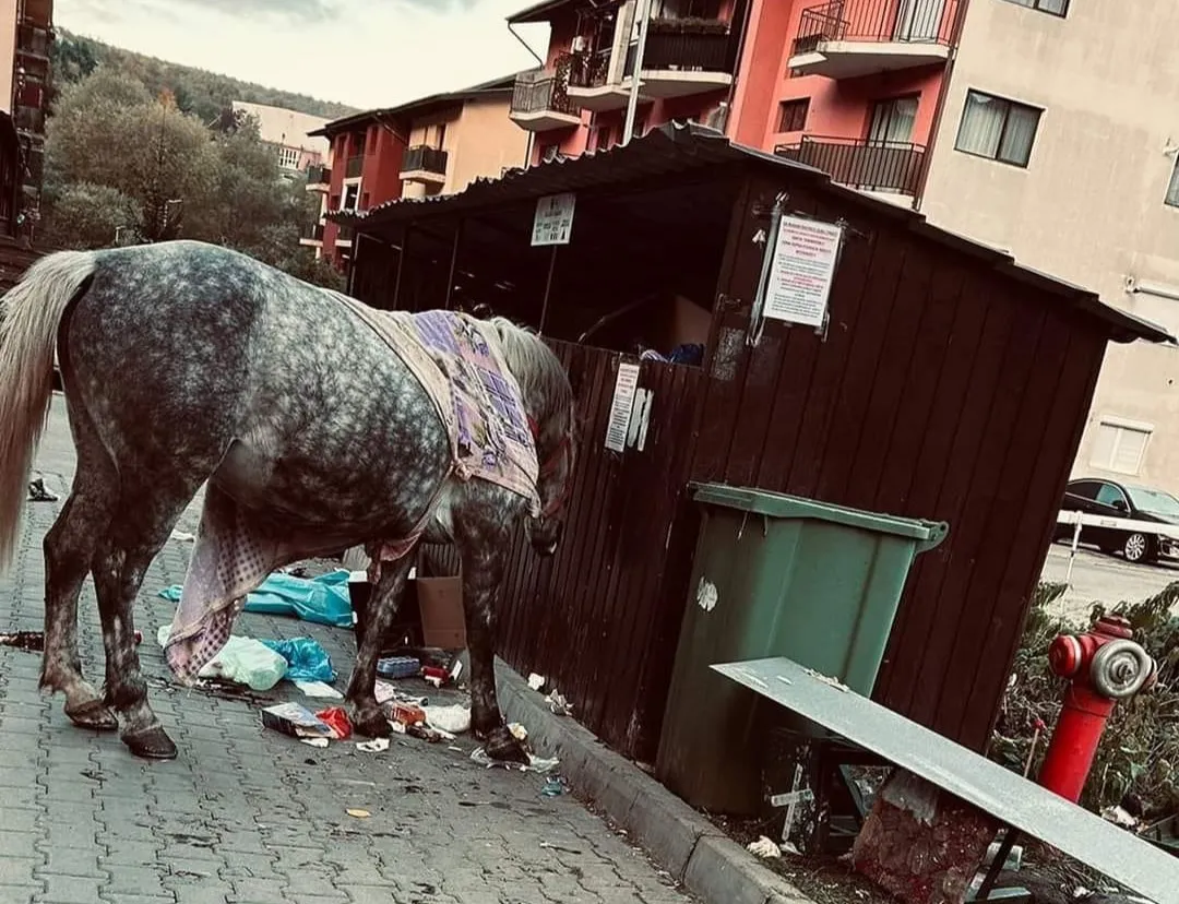 În căutarea mâncării, atrași de mirosul de la punctele gospodărești, caii au început să smulgă sacii plini de gunoaie și să-i tragă în afara ghenelor.