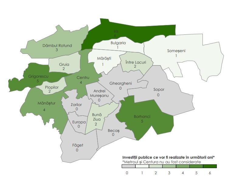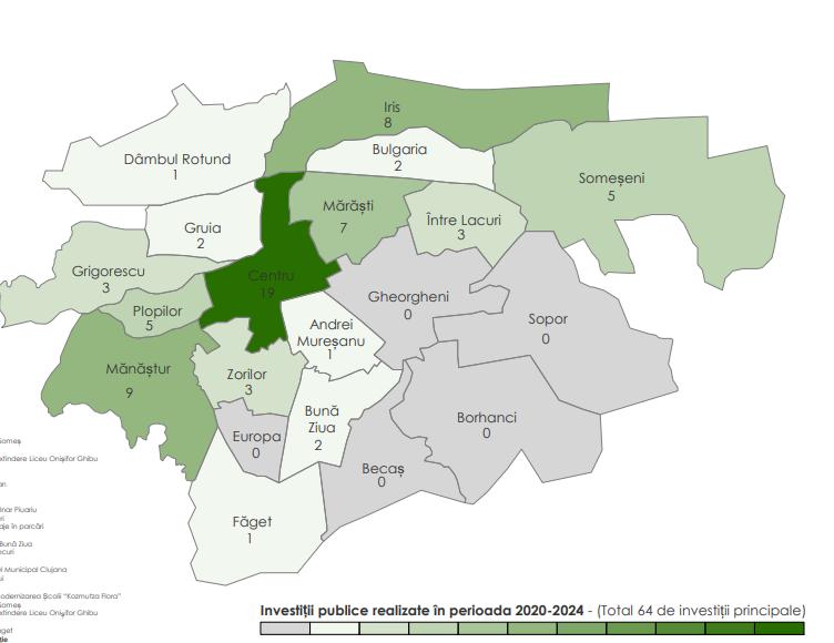 Astfel, potrivit studiului, investițiile din ultimii 5 ani sunt inegal distribuite, cele mai multe fiind în centru. În centru s-au făcut în ultimii ani 19 investiții, urmate de 9 în Mănăștur, și 8 în Iris.