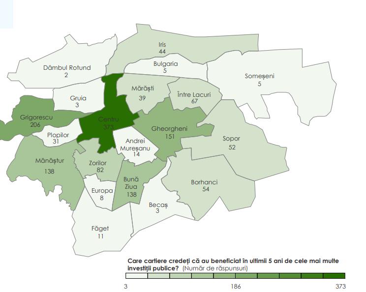 Potrivit realizatorului studiului ,,Percepția respondenților pare a fi influențată mai degrabă de amploarea proiectelor decât de numărul lor efectiv. De asemenea, este posibil ca mulți să considere cartierul Plopilor ca parte din Grigorescu, ceea ce ar explica poziția acestuia pe locul al doilea. Cartierele care au înregistrat cele mai puține voturi sunt: Dâmbul Rotund (2), Becaș (3), Gruia (3), Bulgaria (5), Someșeni (5), Europa (8), Făget (11) și Andrei Mureșanu (14). Percepția asupra lipsei de investiții în aceste zone pare a fi corectă și reflectă realitatea.”