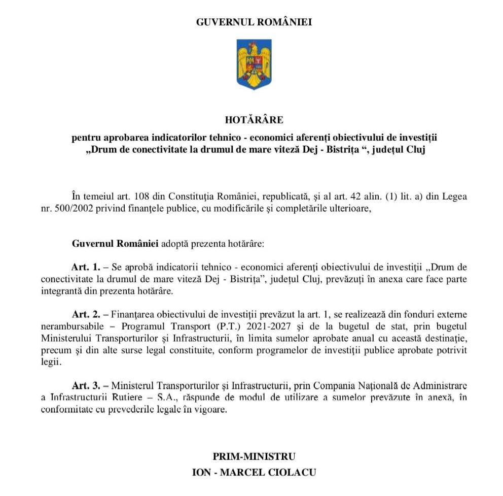 Guvernul României a aprobat indicatorii tehnico-economici pentru realizarea obiectivului de investiții „Drum de conectivitate la drumul de mare viteză Dej – Bistrița”, județul Cluj, mult așteptata centură ocolitoare a municipiului Dej. Proiectul reprezintă o investiție majoră susținută de premierul Marcel Ciolacu și ministrul Transporturilor, Sorin Grindeanu, care promite să aducă numeroase beneficii pentru locuitorii din Dej și din întreaga zonă.