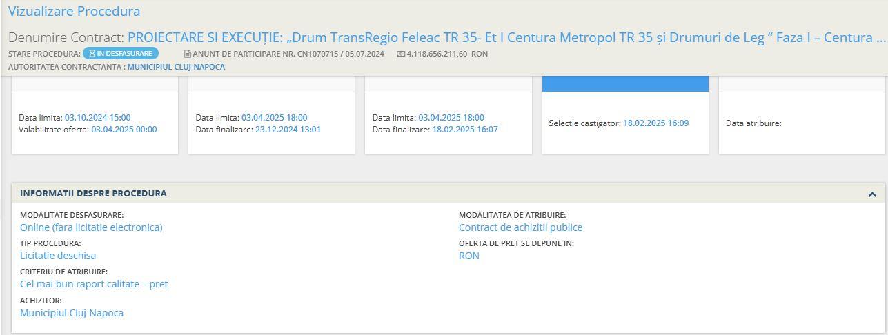 Într-adevăr, platforma de licitații arată că selecția câștigătorului ar fi fost făcută în 18.02.2024, însă nu specifică rezultatul. Fiind vorba de un singur ofertant, însă, dacă nu a existat vreun viciu de procedură care să ducă la anulare, doar asocierea condusă de firma bistrițeană Dimex putea câștiga.