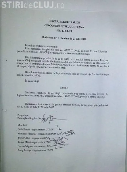 "Prin sesizarea înregistrată sub nr. 47/27.07.2012, domnul Remus Lăpuşan - preşedinte al filialei PSD cluj, învederează următoatea situaţie de fapt:
