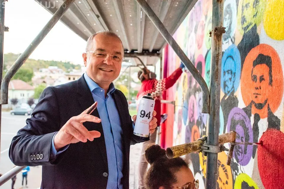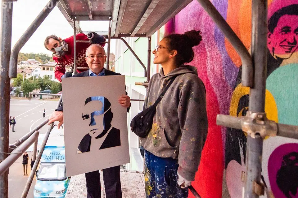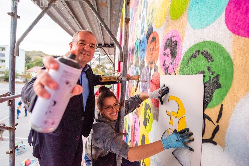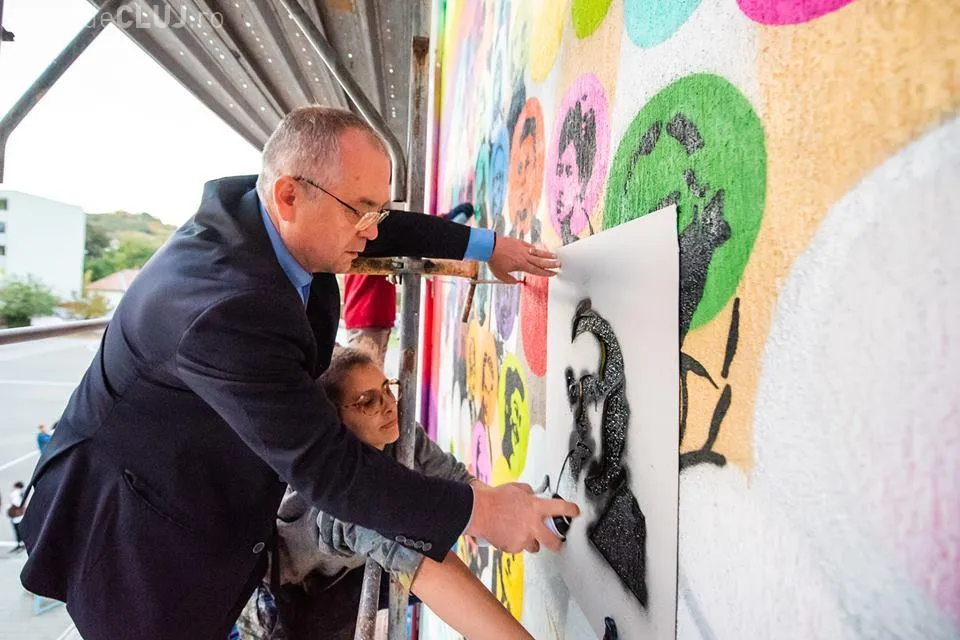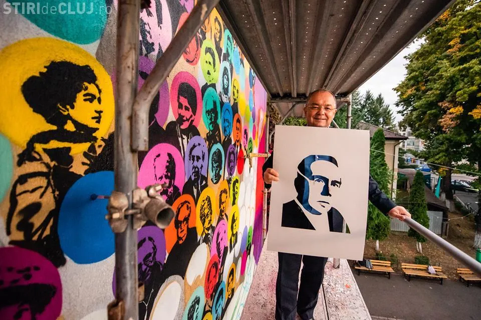 Primarul Emil Boc s-a dus și el la liceul clujean și a imprimat pe lurrarea murală a profilului marelui istoric, Vasile Pârvan.