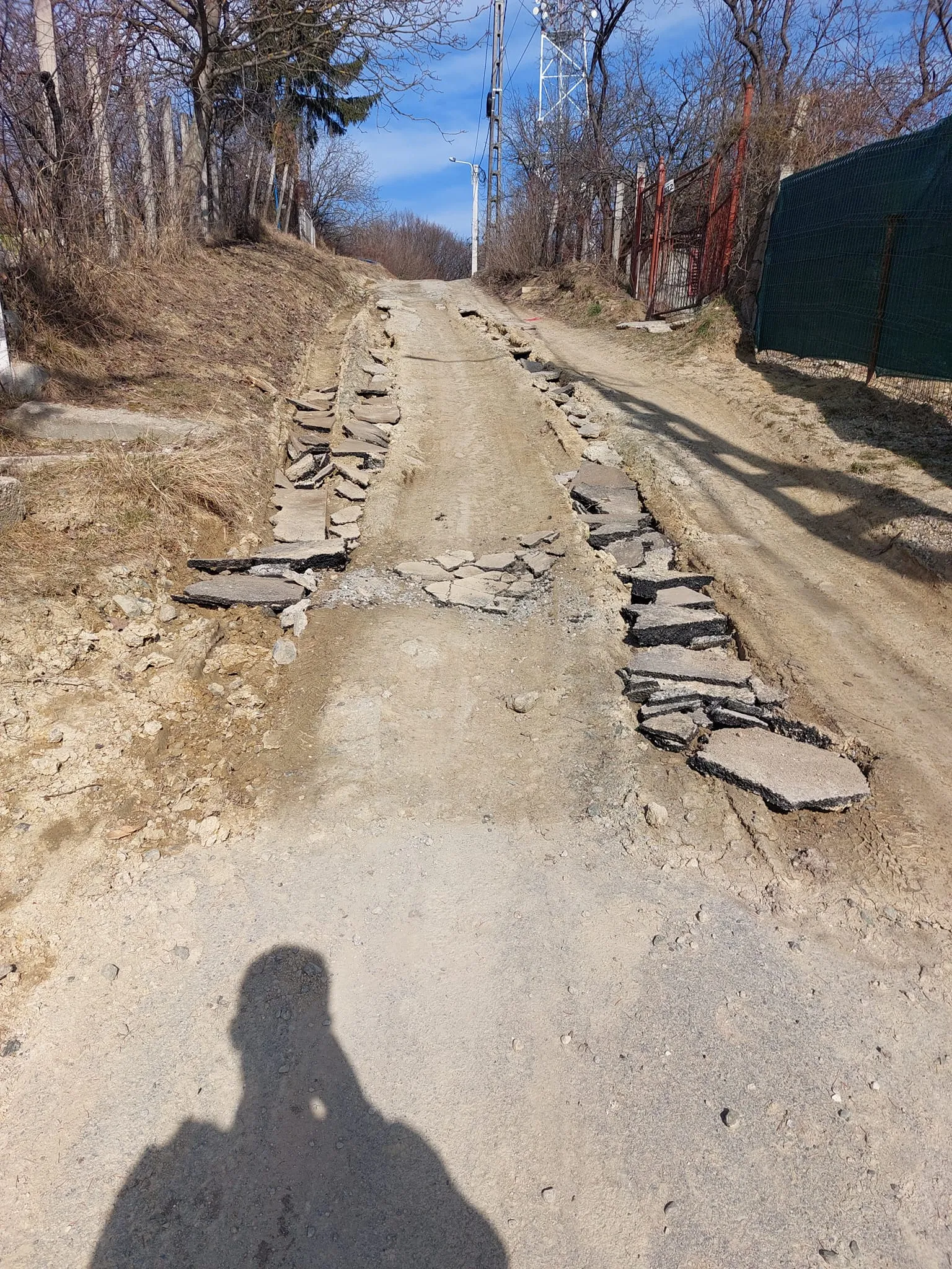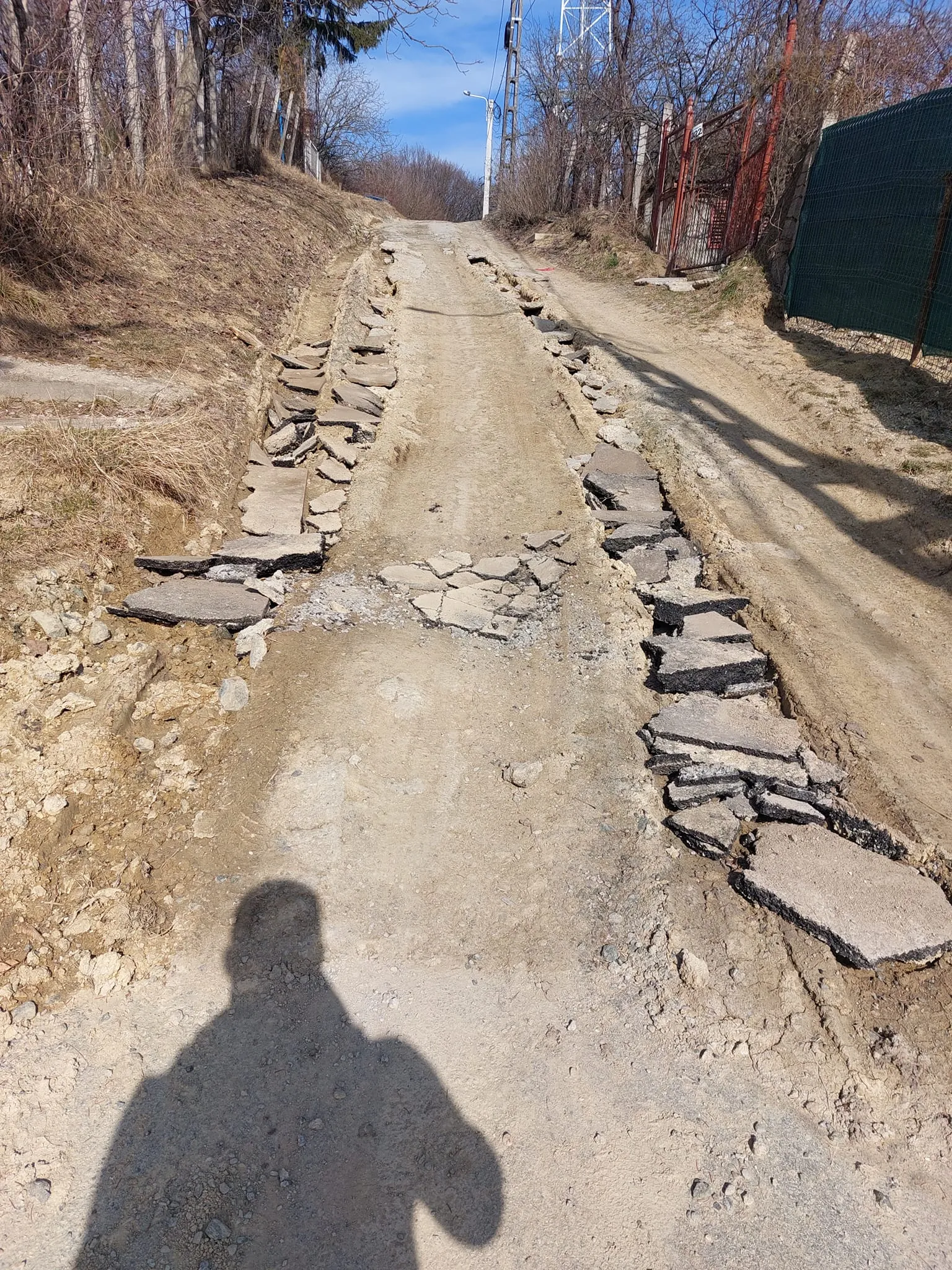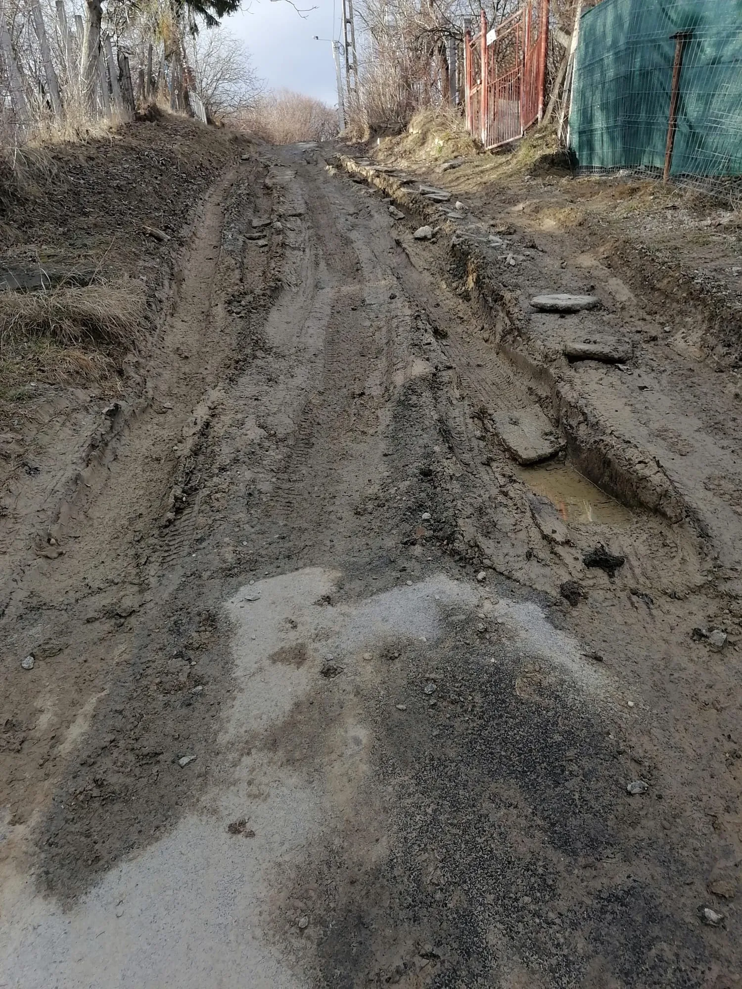 Nu este clar cine a făcut cărarea din bucăți de asfalt aduse de pe străzile decopertate din Cluj-Napoca. Cert este că noroiul este prea mare pentru a rezista.