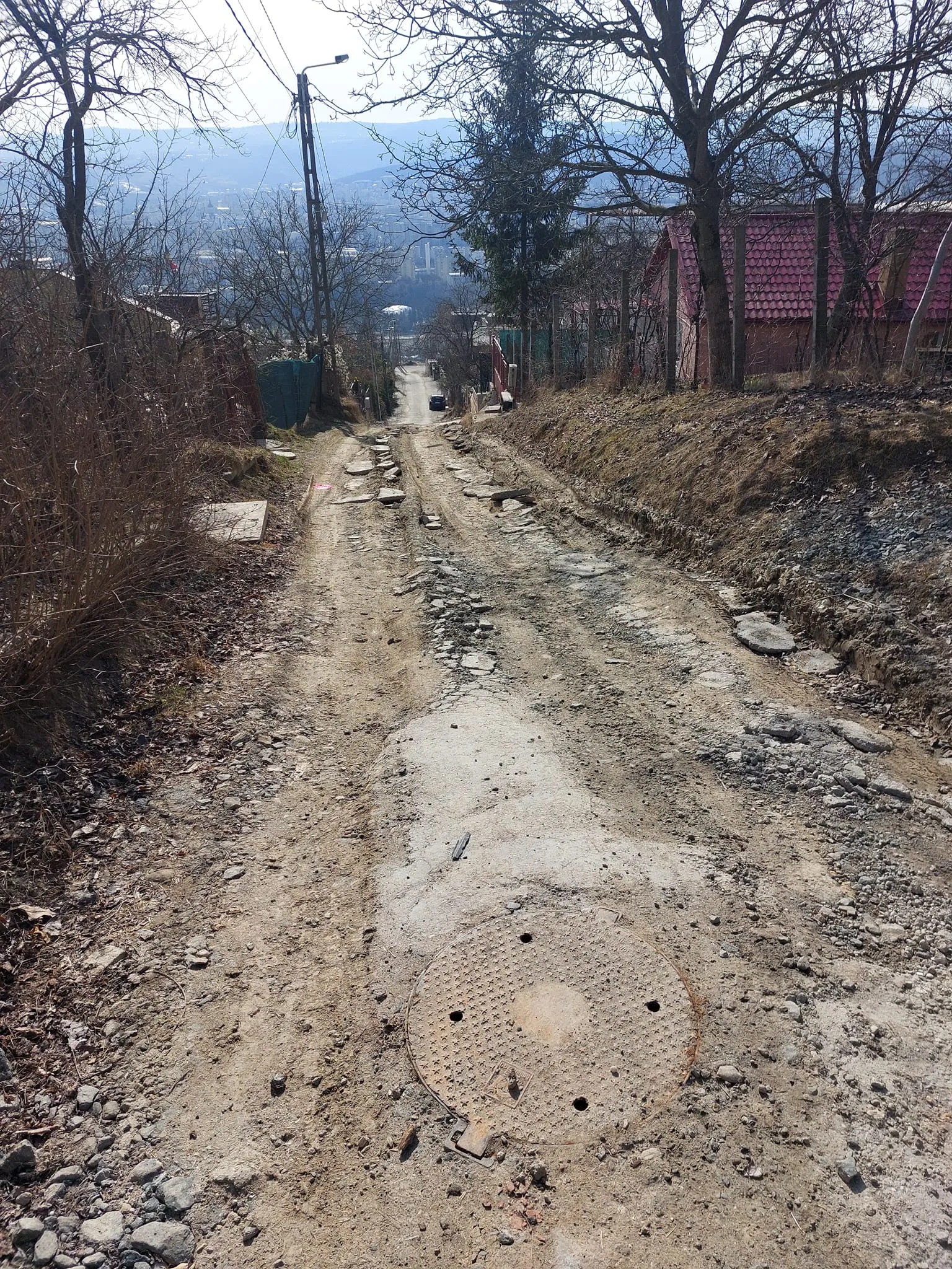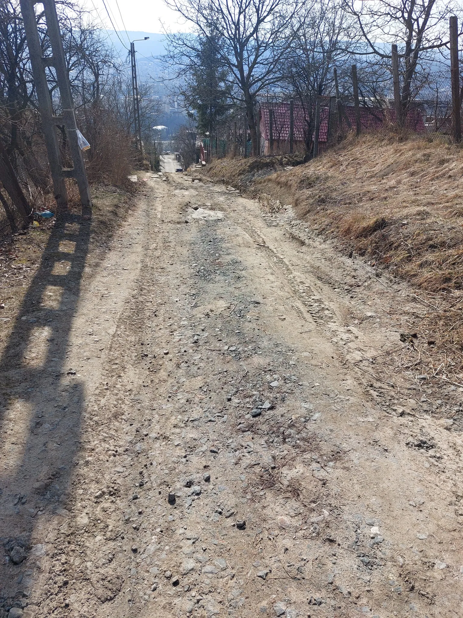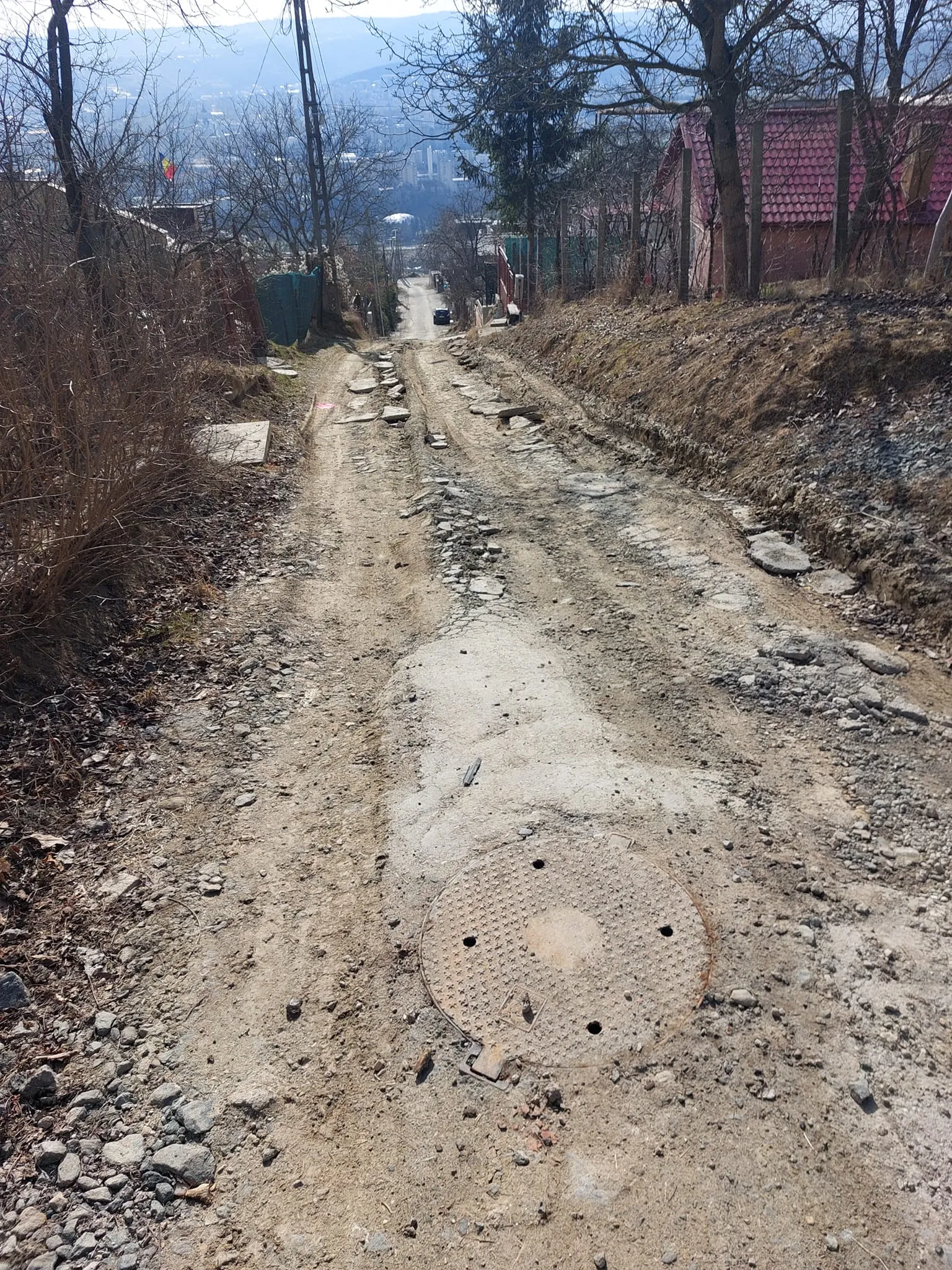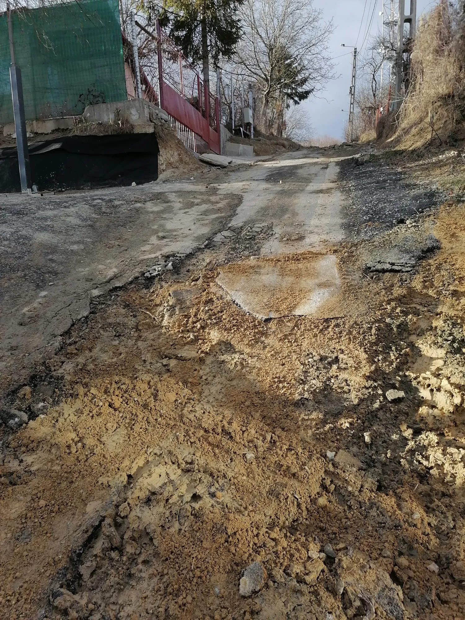 Nu este clar cine a făcut cărarea din bucăți de asfalt aduse de pe străzile decopertate din Cluj-Napoca. Cert este că noroiul este prea mare pentru a rezista.
