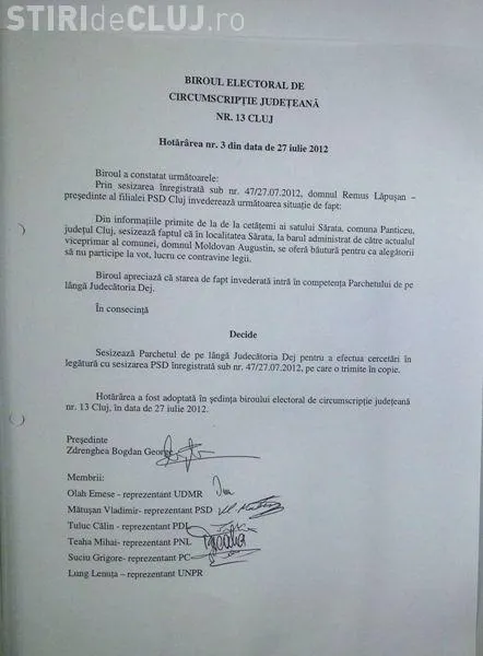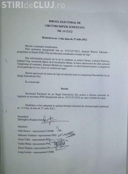 "Din informaţiile primite de la cetăţeni ai comunei Băişoara, rezultă că doamna Luca Minodora (n.red. PDL), primar în funcţie al comunei Băişoara, ameninţă locuitprii să nu participe la Referendumul pentru demiterea preşedintelui României, organizat în data de 29 iulie, lucru ce contravine ordinii de drept", se arată în documentul remis de BEJ Cluj.
