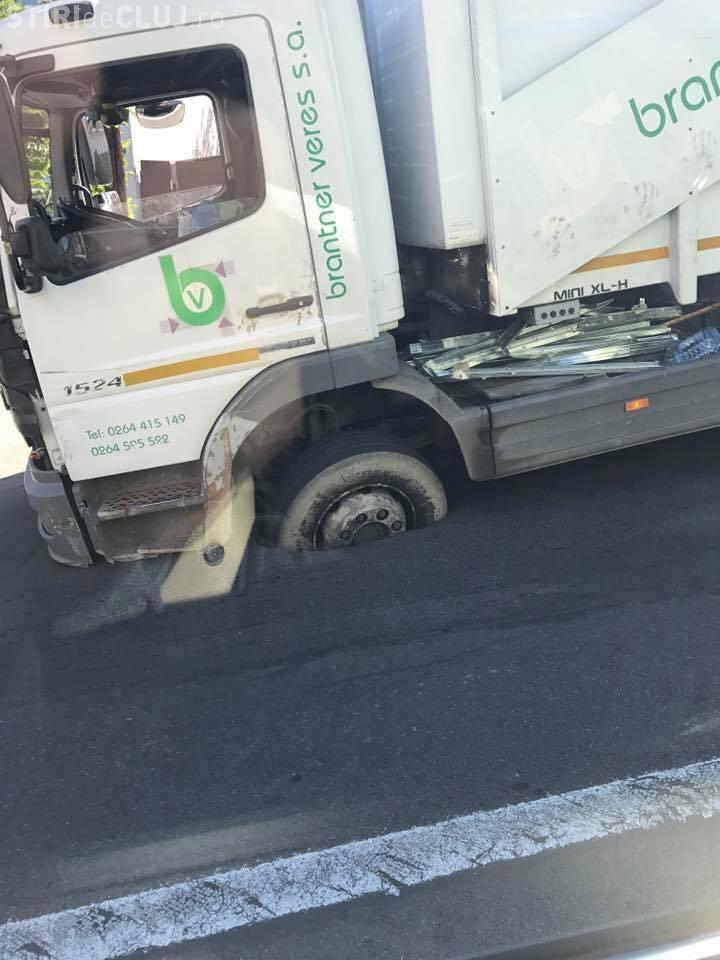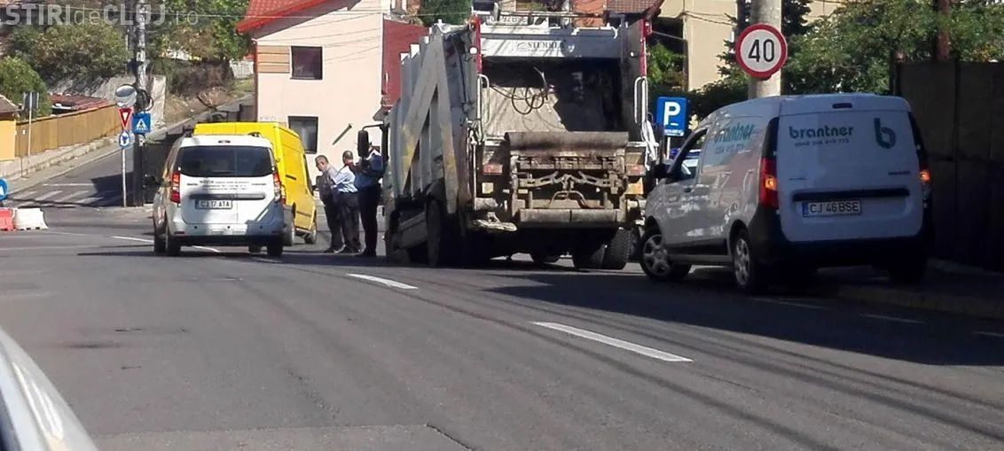 Cluj-Napoca: O mașină de gunoi a rămas blocată în asfalt pe Septimiu Albini - FOTO