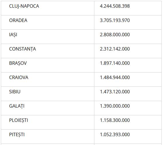 În acest clasament nu apare Bucureștiul, care are bugetele împărțite între sectoare și Primăria Municipiului.