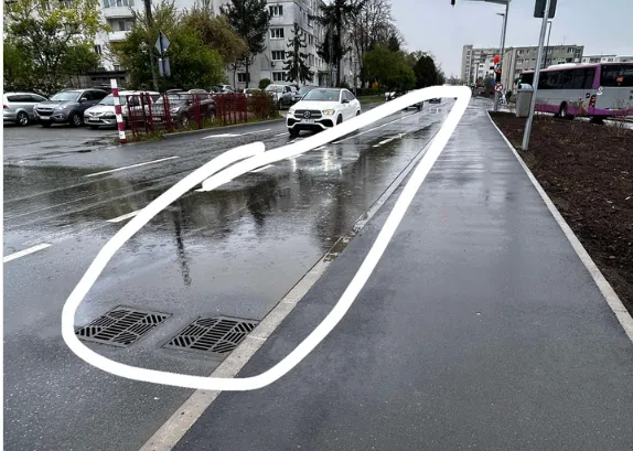 „Uitați-vă bine la poza asta. Am încercuit clar zona în care se vede cum băltește apa. Și mai sunt și multe alte porțiuni pe trotuar, după cum se vede și în poză. Nu e nici măcar o ploaie torențială, să zici că nu a avut timp să se scurgă. Așa de bine știm să facem drumuri... Și nu e singura stradă care a fost asfaltată recent și unde s-a uitat complet de scurgere sau canalizare. Totul s-a făcut pe repede înainte. M-am gândit că dacă vă trimit poza, poate vede și cine trebuie cum s-au cheltuit banii și poate se autosesizează cineva”, a transmis revoltat cititorul Știri de Cluj.