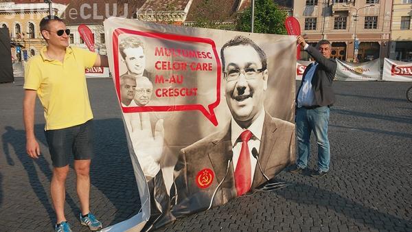 Pe banner erau și pozele lui Nicolae Ceaușescu, Ion Iliescu și Adrian Năstase, cu mesajul ”Mulțumesc celor care m-au crescut!”, atribuit lui Victor Ponta. Pe fotografie mai apărea și ”Secera și ciocanu”, însemnele fostului Partid Comunist Român.