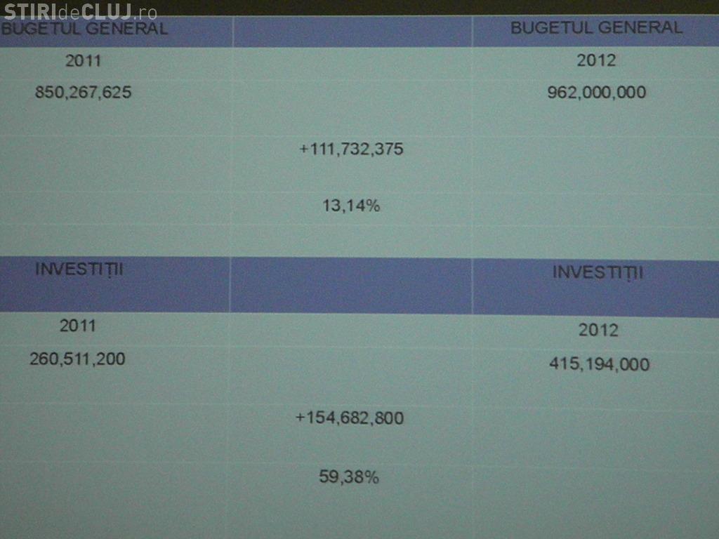 Bugetul general al municipiului va fi in 2012 de 962.000.000 de lei, fata de 850.267.625 de lei, in 2011. "Bugetul creste cu 13,14%, adica un plus de 111.732.375 de lei", a declarat primarul interimar Radu Moisin.