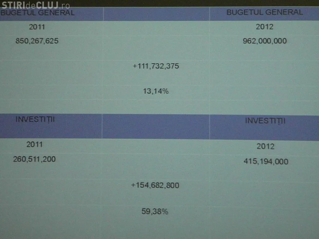 Primaria Cluj-Napoca a anuntat ca in 2012 bugetul de investitii va fi de 415.194.000 de lei, in crestere cu 59,38% fata de anul 2011.