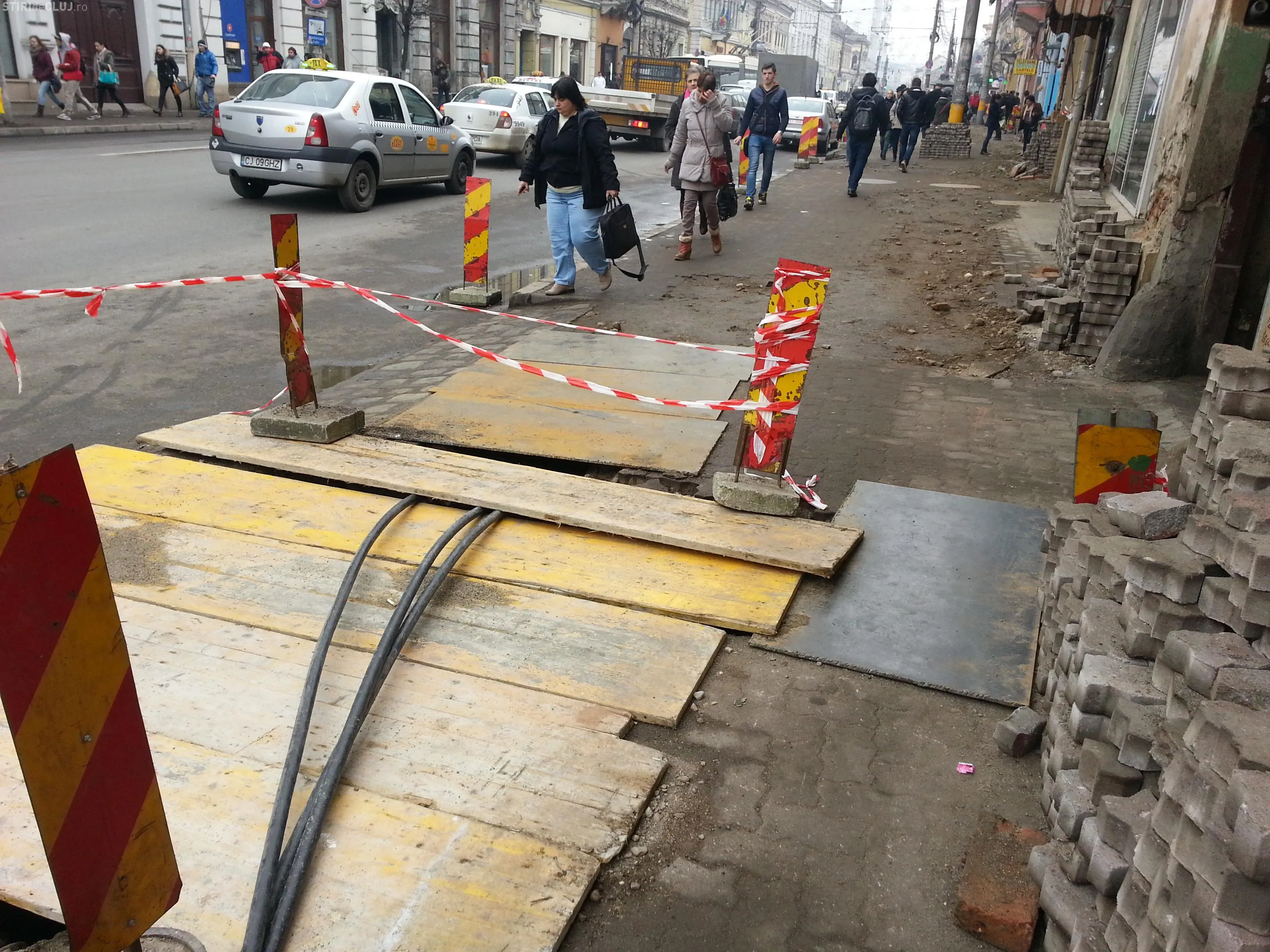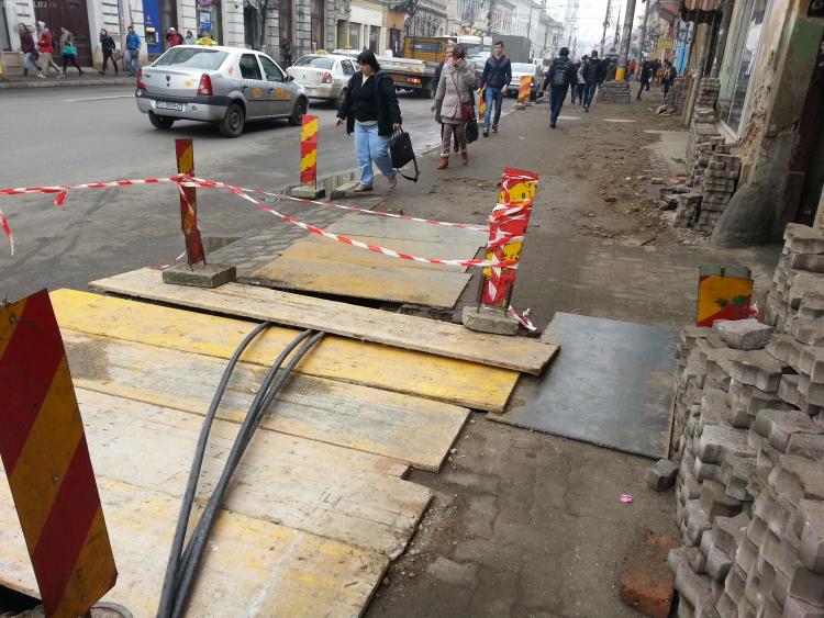 Lucrările au început pe strada Memorandumului, unde muncitorii au luat dalele de pe trotuar, pentru a introduce cablurile în subteran, dar au uitat să se mai prezinte și la lucru. Luni, în jurul orei 13.00, nici țipenie de muncitor de la firma CFO Integrator, nu era în zona străzii Memorandumului.