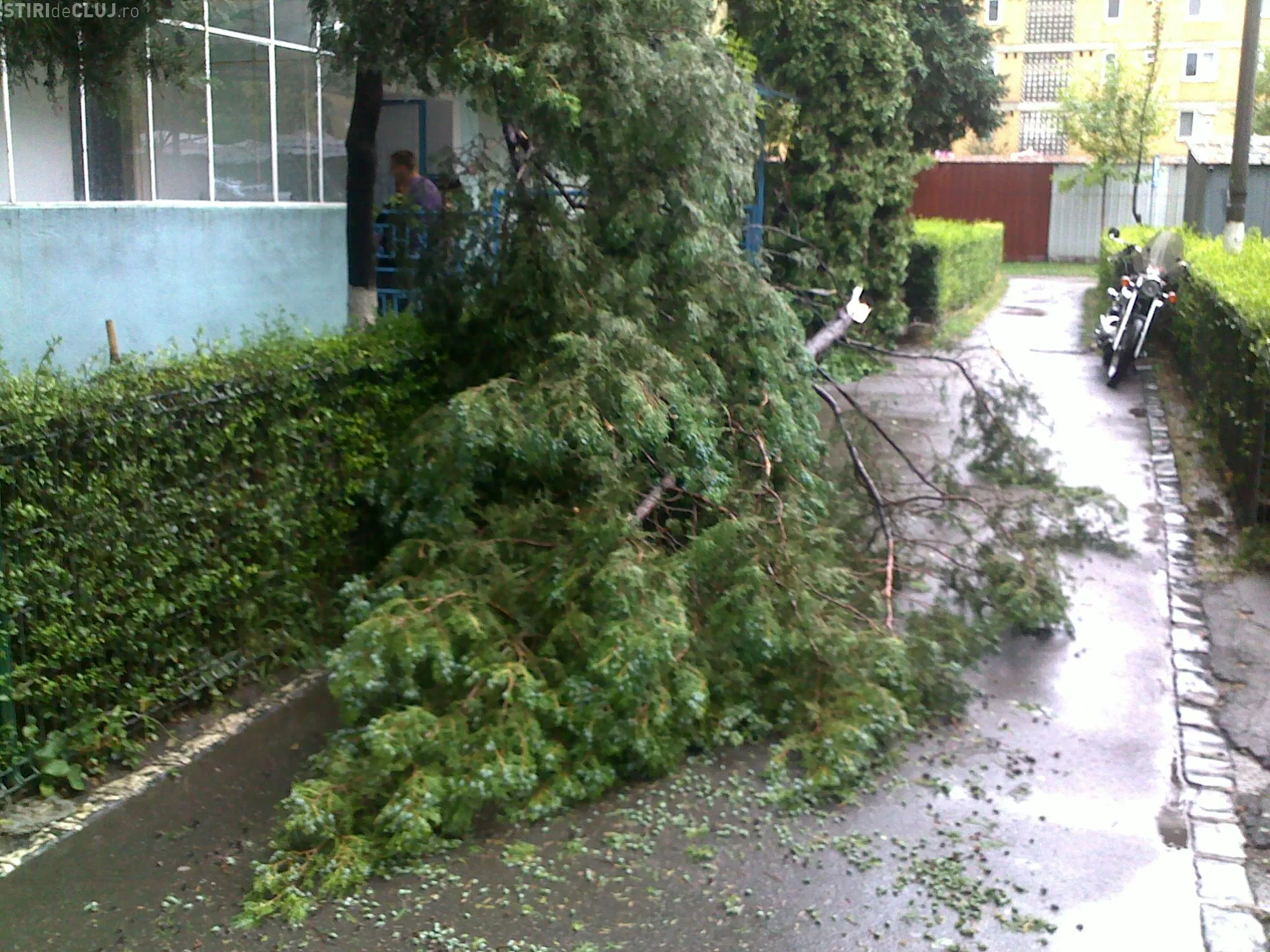 Mai multi copaci de pe strada Bizusa, din Cluj-Napoca, au fost rupti de furtuna de acum doua saptamani. Unul dintre copaci a fost indoit si acum se apleaca amenintator peste aleea unde se joaca cei mici si pe unde trec oameni. Angajatii de la RADP spun, insa, ca nu prezinta pericol.