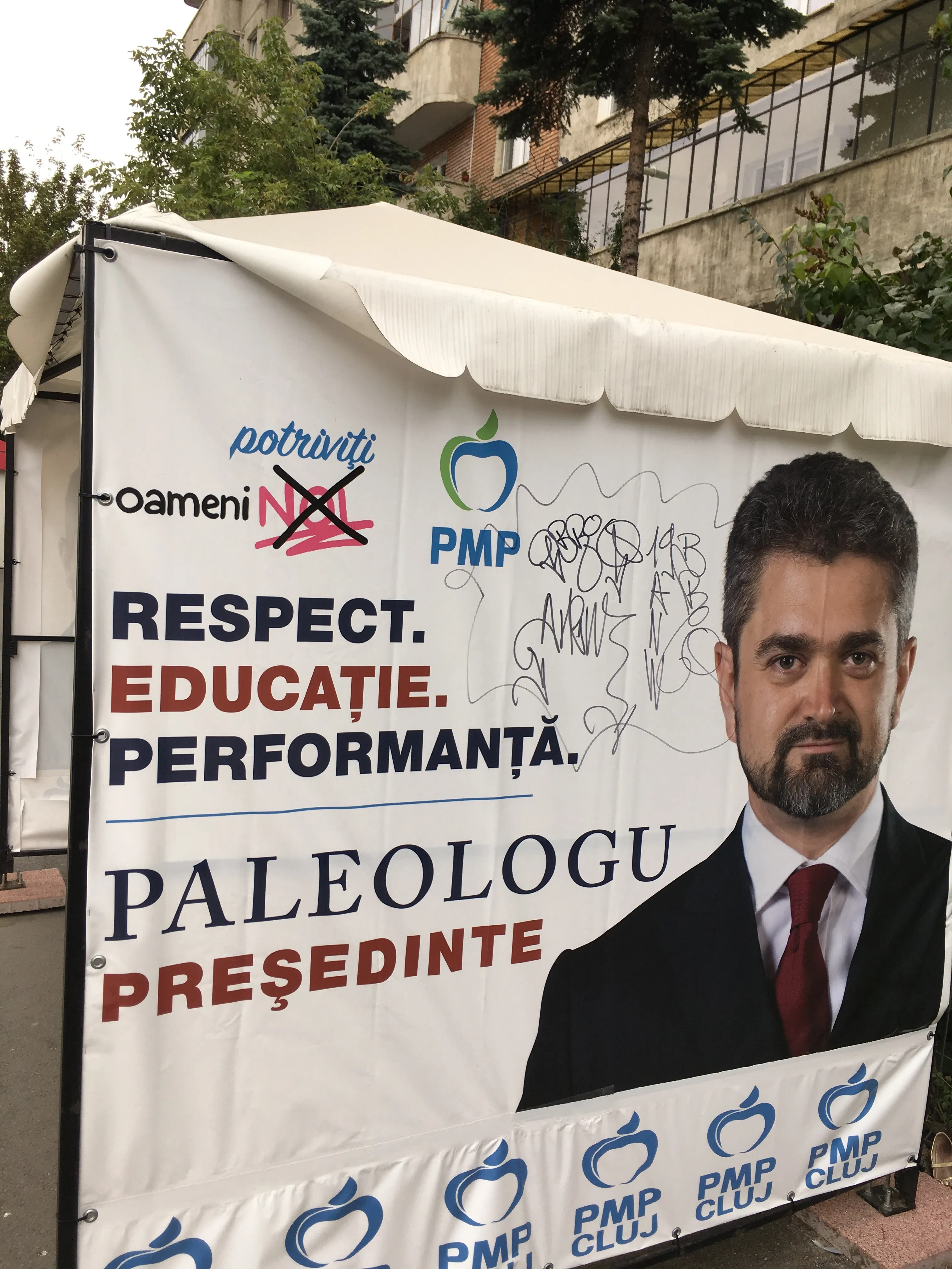 Cortul PMP Cluj îl promovează pe candidatul la funcția de Președinte al României, diplomatul Theodor Paleologu. Bannerele de susținere ale candidatului PMP au fost mâzgălite și tăiate după nici două săptămâni de la instalarea cortului.