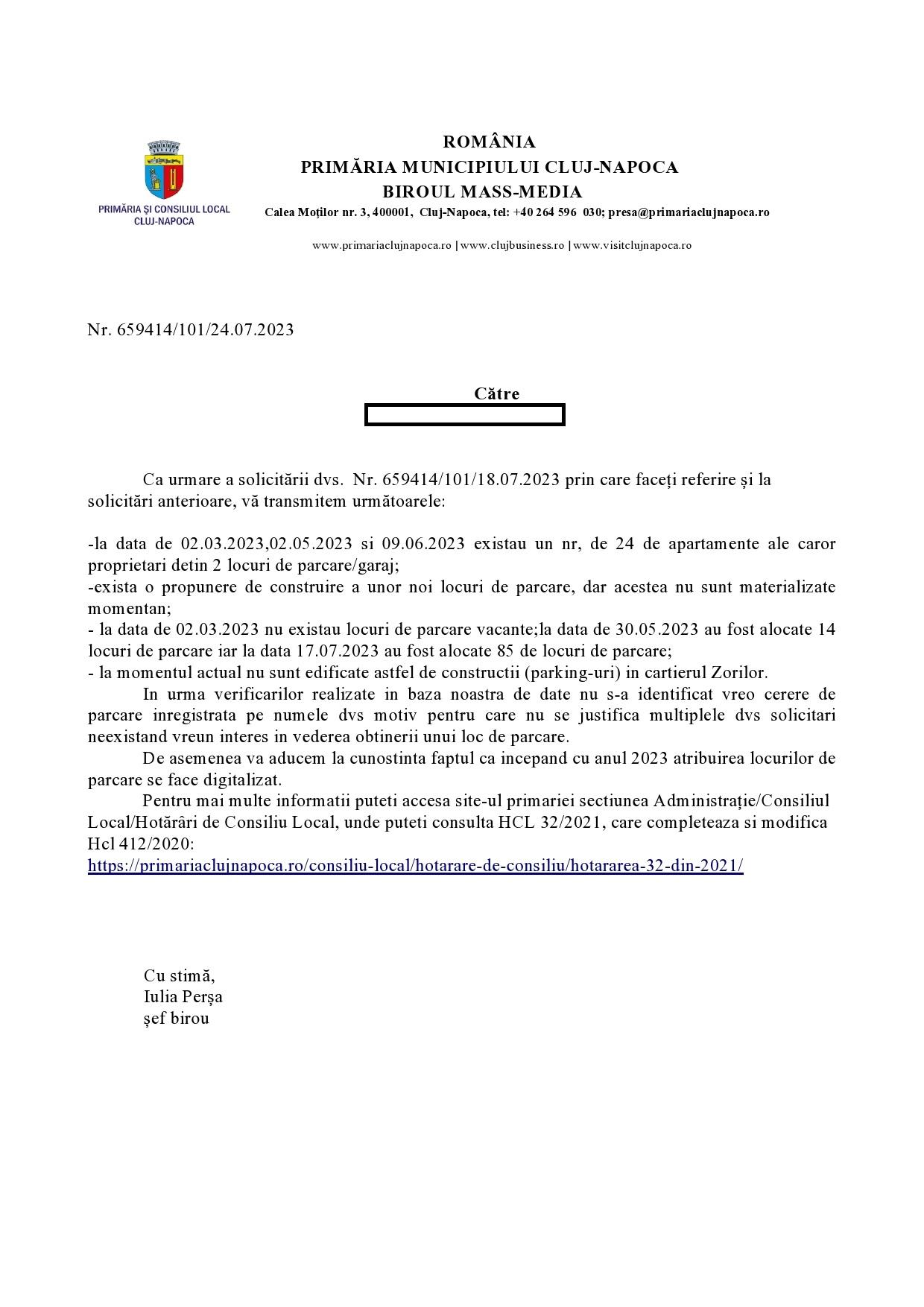 am revenit cu o nouă cerere în 18 iulie, la care mi s-a răspuns parțial și care precizează că ”nu s-a identificat vreo cerere de parcare înregistrată pe numele dvs, motiv pentru care nu se justifica multiplele dvs solicitări, neexistând vreun interes in vederea obținerii unui loc de parcare”;