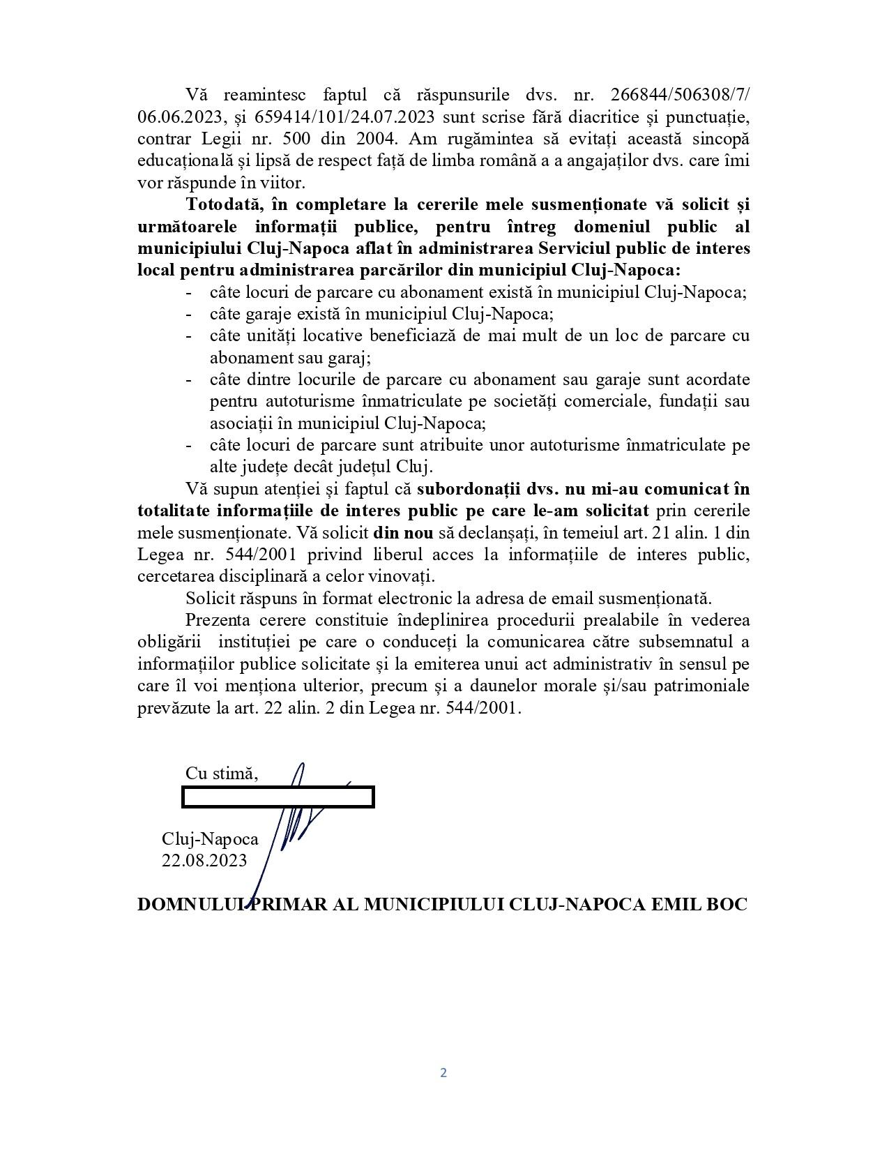 prin răspunsul al primăriei, deși anterior am trimis încă cinci adrese, prima fiind încă din luna martie, se pune sub semnul întrebării însăși faptul că mi-aș menține solicitările: ”În condițiile în care vă mențineți solicitarea referitoare la situația numărului de abonați care dețin autoturisme înmatriculate în alte județe decât județul Cluj, vă informăm că aceasta necesită o perioada mai lungă de timp deoarece necesită o interogare complexă a bazei de date”;