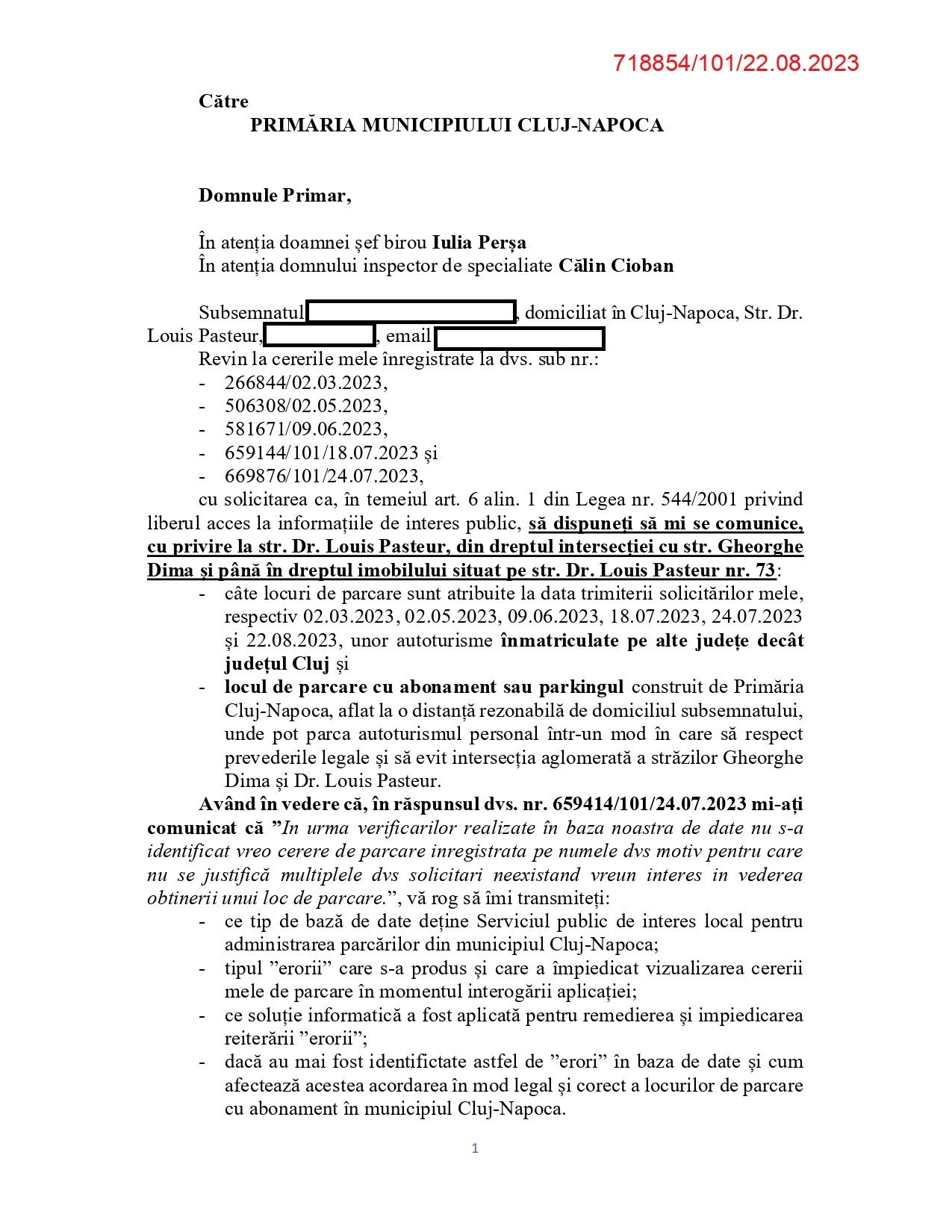 Un clujean cere un loc de parcare de ani de zile de la Primăria Cluj-Napoca, acuză funcționarii de ”incompetență, indolență, obrăznicie, mă iau la bășcălie, încalcă legea informațiilor publice, etc”.