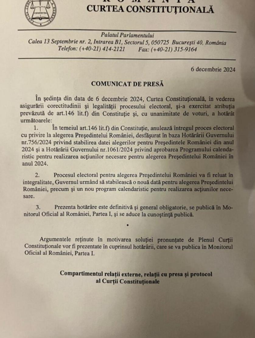 UPDATE: E OFICIAL! Curtea Constituțională a anulat turul 1 al alegerilor prezidențiale. Alegerile vor fi reluate