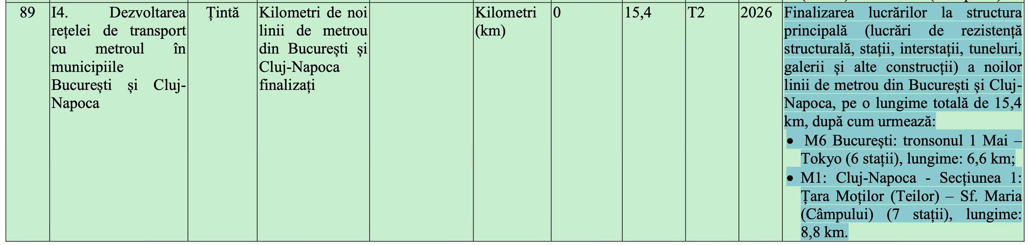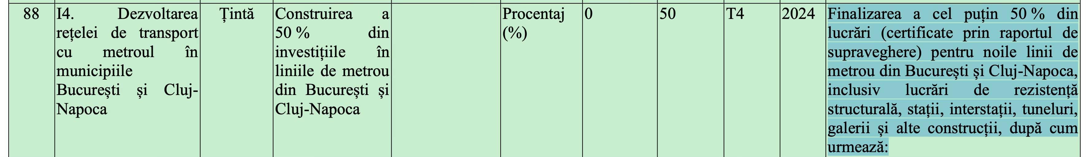 În realitate, în PNRR -ul renegociat scrie de fapt că în 2024 trebuie finalizate cel puțin 50% din lucrările pentru metroul din Cluj-Napoca, inclusiv lucrări de rezistență structurală, stații, interstații, tuneluri, galerii.