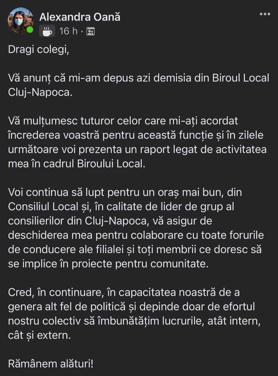 Voi continua să lupt pentru un oraş mai bun, din Consiliul Local şi, în calitate de lider de grup al consilierilor din Cluj-Napoca, vă asigur de deschiderea mea pentru colaborare cu toate forurile de conducere ale filialei şi toţi membrii ce doresc să se implice în proiecte pentru comunitate. Cred, în continuare, în capacitatea noastră de a genera alt fel de politică şi depinde doar de efortul nostru colectiv să îmbunătăţim lucrurile, atât intern, cât şi extern. Rămânem alături!”, a anunțat și consilierul local Alexandra Oană.