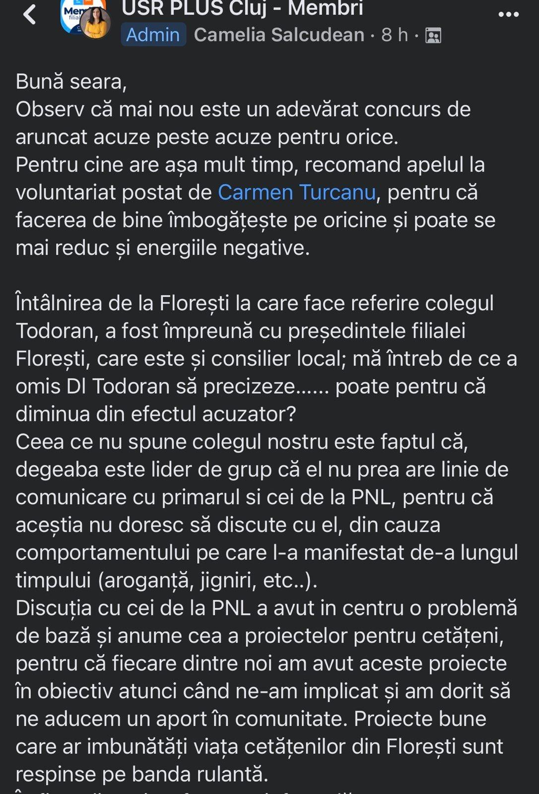 Liderul de grup al consilierilor locali din Florești a confruntat-o pe fata pe președinta biroului județean pentru întâlnirile pe care aceasta le-a avut cu PNL Florești”, se arată într-un mesaj al membrilor USR Cluj.