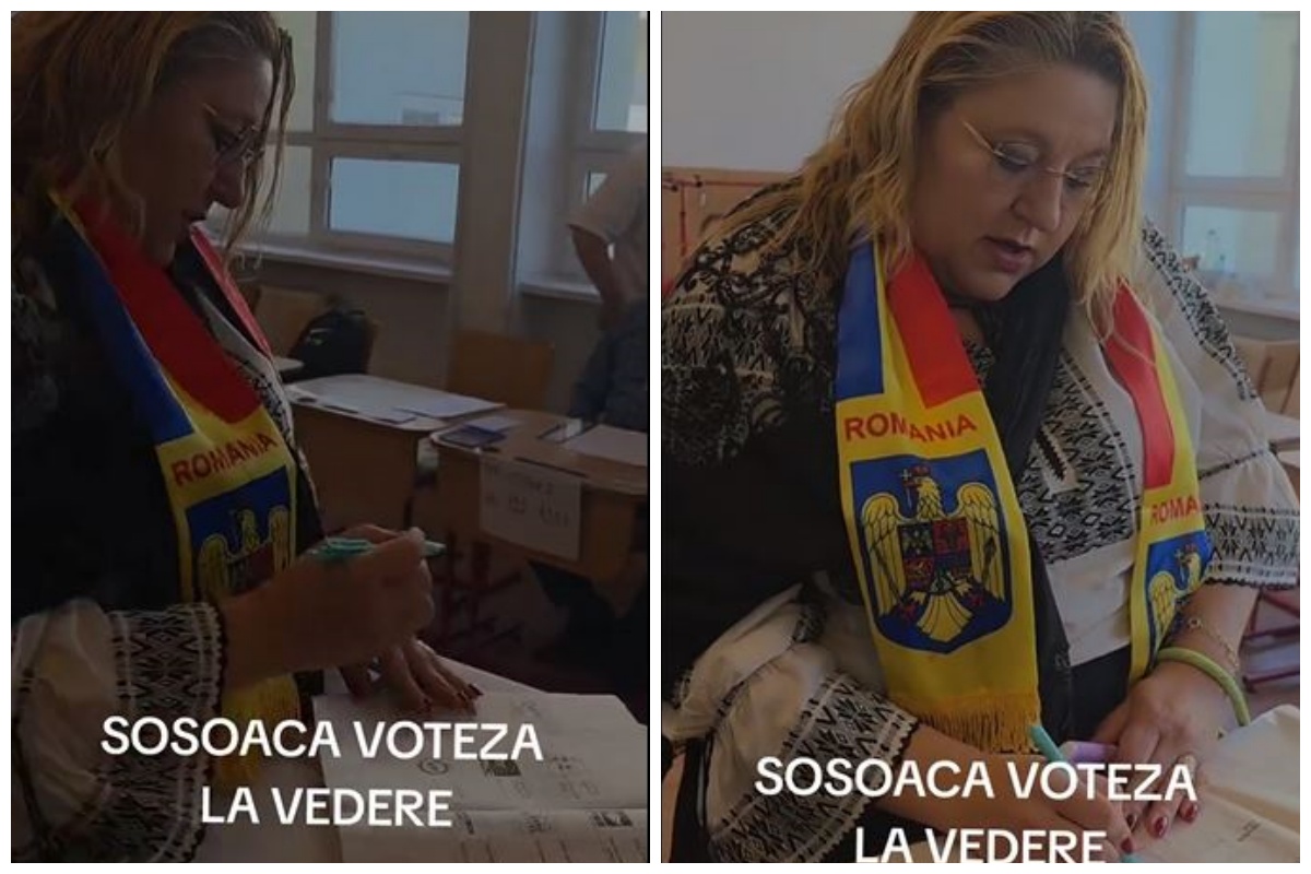 „Și mă pun și eu aici, SOS România, Diana Iovanovici Șoșoacă”, a spus eurodeputata, în timp ce plasa ștampila de vot pe numele scrise cu pixul.