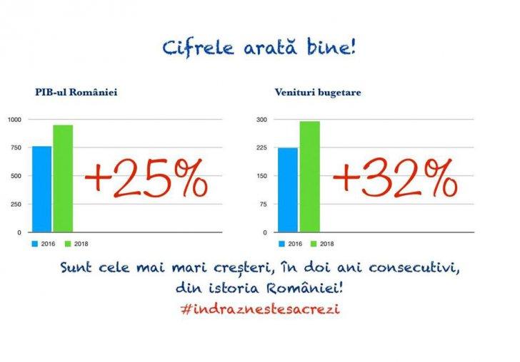 Astfel, Liviu Dragnea, a scris duminică pe Facebook că Produsul Intern Brut al României a ajuns în 2018 la 949,6 miliarde de lei, cu 188,2 miliarde de lei în plus faţă de 2016, adică o creştere de 25%. Sunt cele mai mai creşteri, în doi ani consecutivi, din istoria României, a adăugat el.
