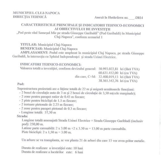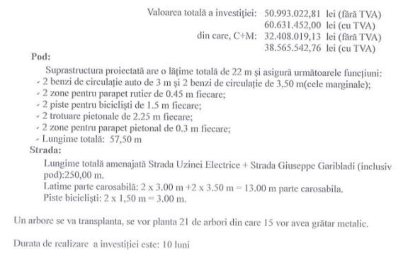 Valoarea totală a investiției în modernizarea Podului Garibaldi și a zonei adiacente este estimată la 60 de milioane de lei, din care jumătate reprezintă costurile pentru noul pod. Podul reconstruit va avea două benzi de circulație auto, piste pentru bicicliști și trotuare pietonale, oferind o infrastructură modernă și sigură.