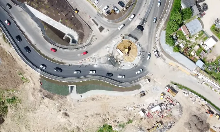 Imaginile din dronă arată că în sensul giratoriu de pe Frunzișului este aproape imposibil să treacă două autoturisme în același timp.