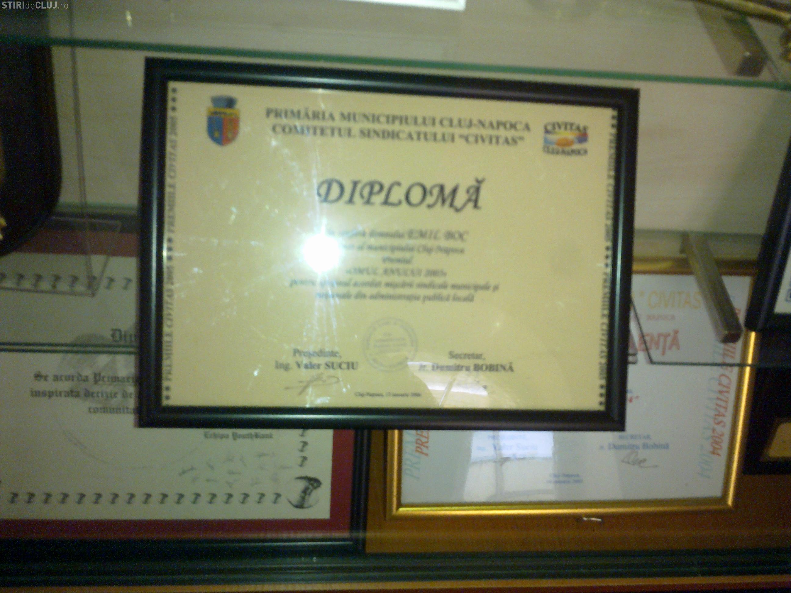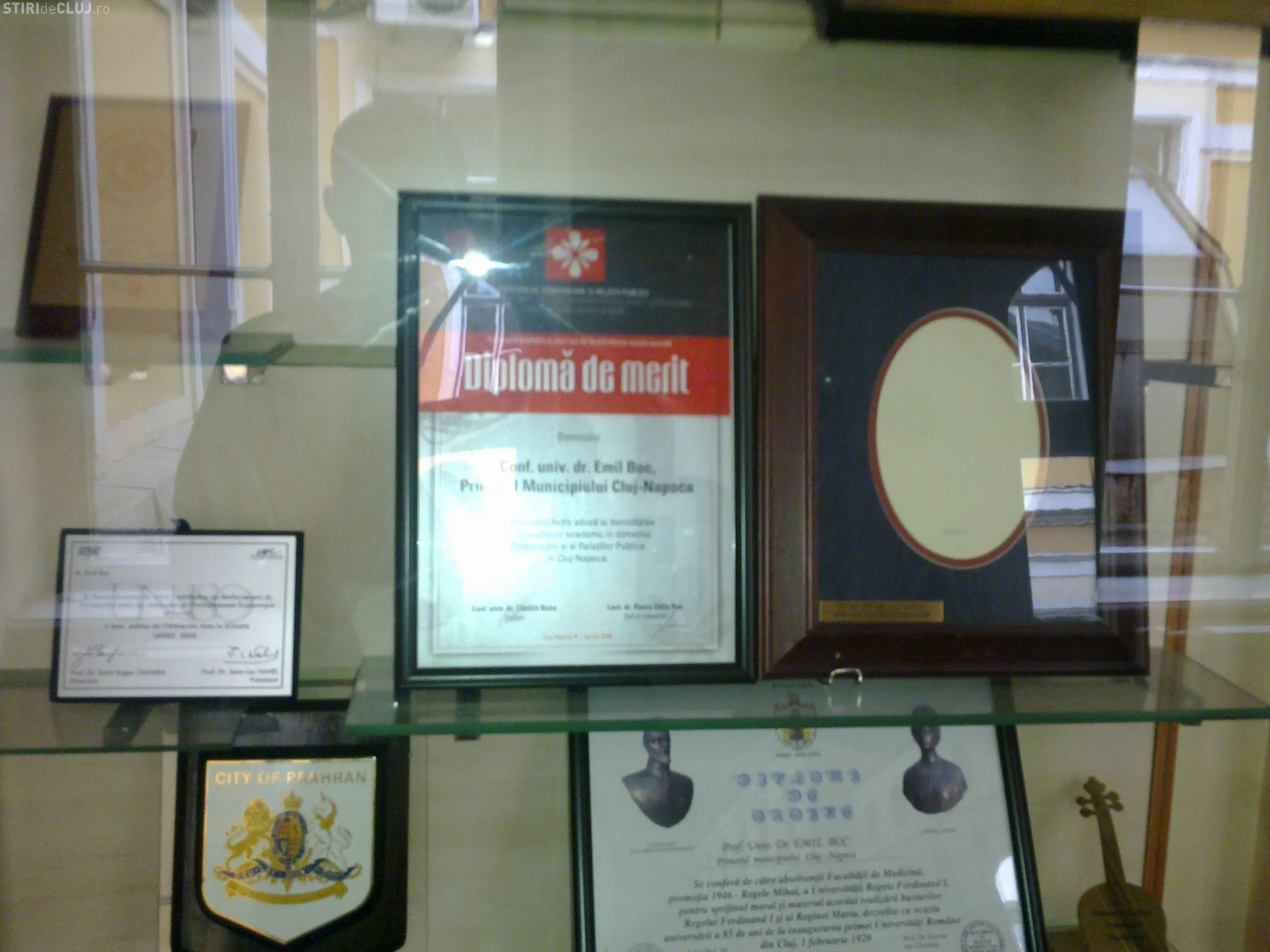 In locul diplomelor si a trofeelor pe care era trecut numele Apostu, au aparut cele ale fostului primar si prim ministru Emil Boc, scoase de la "naftalina" de angajatii municipalitatii.