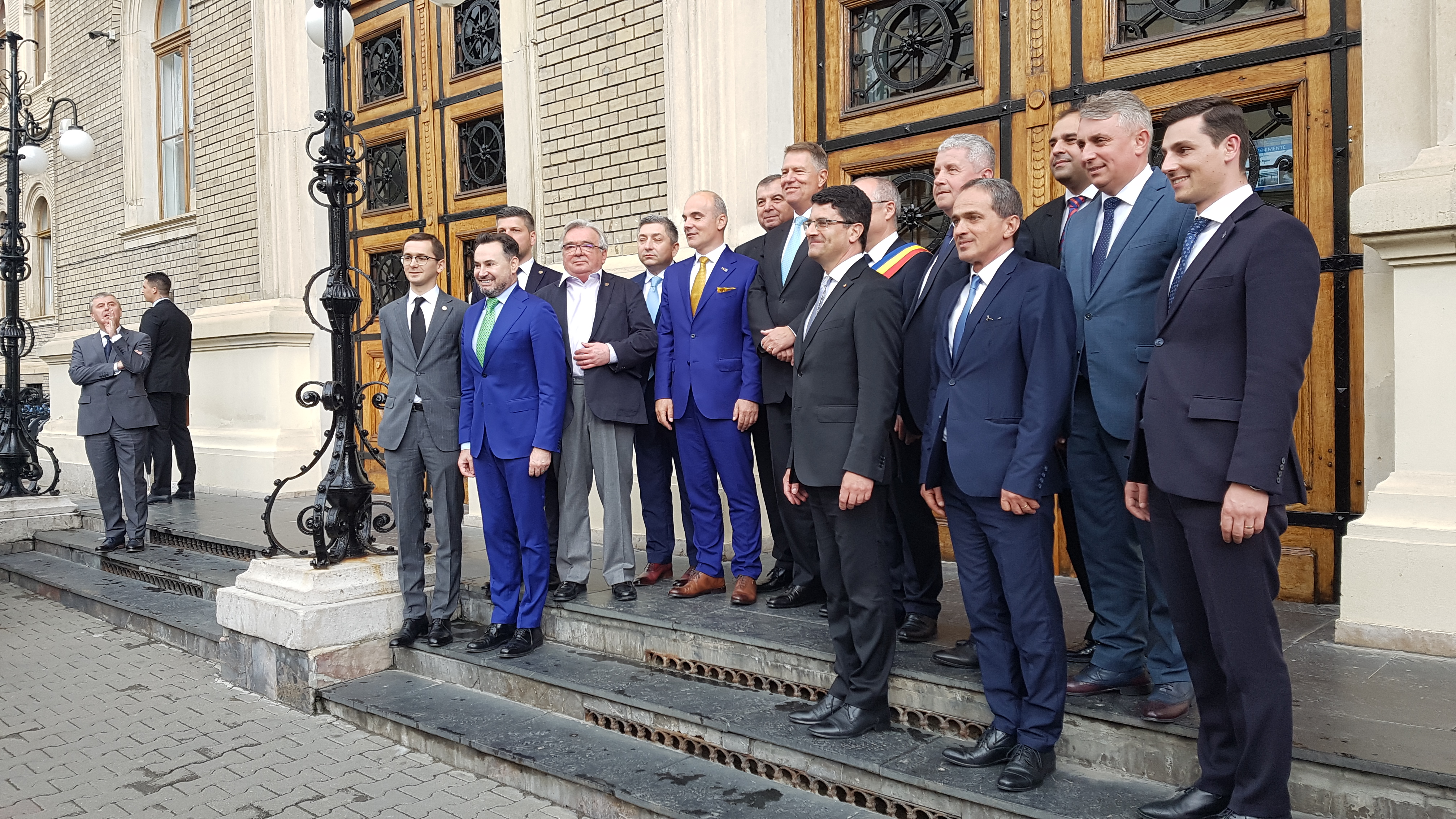 Delegația PNL s-a oprit pe scările din fața UBB Cluj, pentru o poză de grup, pentru a marca locul în care Klaus Iohannis a ales să își lanseze pentru a treia oară cartea, după București și al Iași.