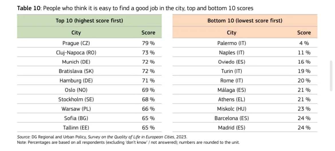 De asemenea, 73% dintre membrii comunității consideră că este ușor să îți găsești o slujbă bună la Cluj-Napoca. Din această perspectivă Clujul se clasează pe locul II în U.E., pe primul fiind orașul Praga.