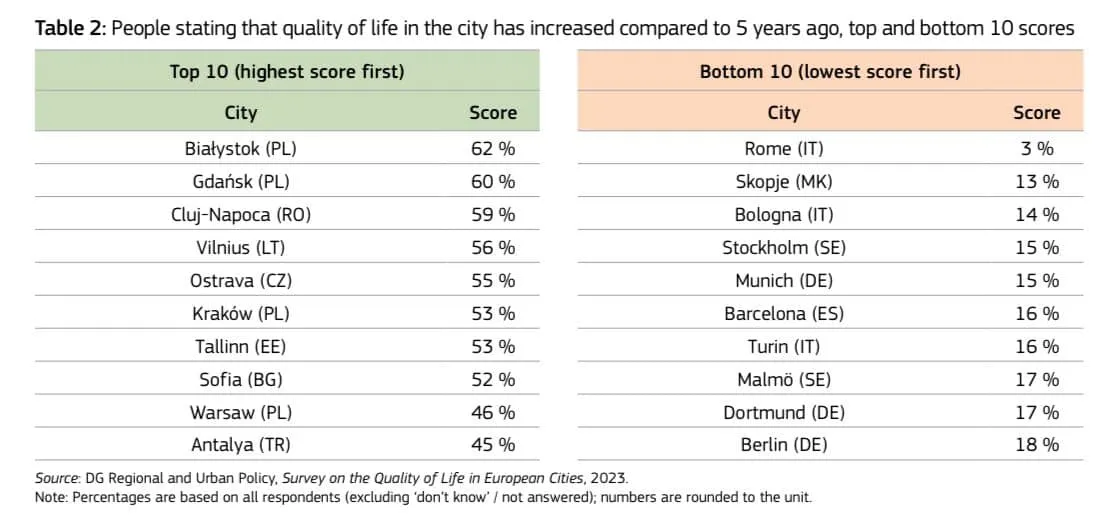 Din cele 83 orașe cuprinse în raportul U.E., calitatea vieții în Cluj-Napoca a înregistrat una dintre cele mai mari creșteri față de acum 5 ani, Clujul fiind depășit de doar două orașe din Polonia.