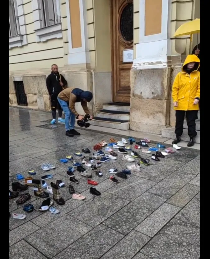 Copiii de la Pata Rât au protestat în fața Primăriei și și-au pus papucii, ca semn că nu au unde locui dacă sunt evacuați.