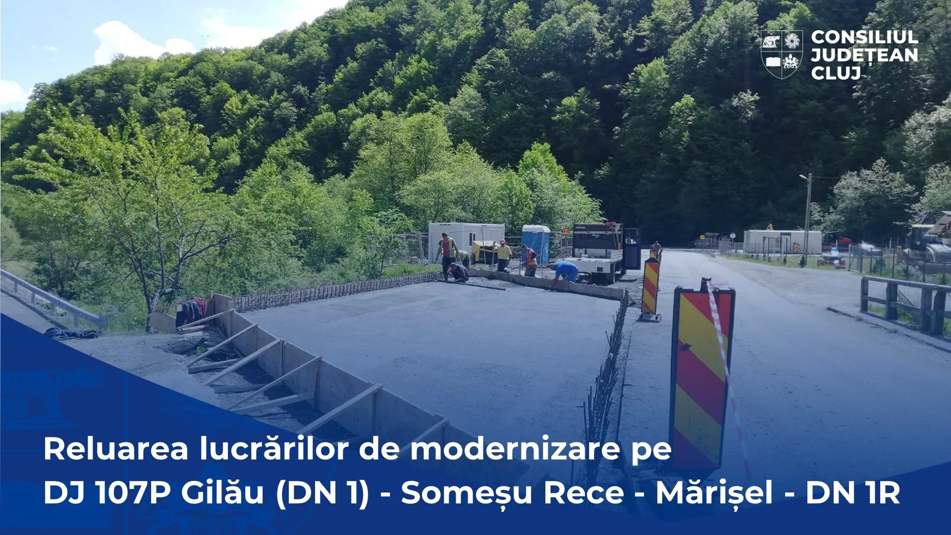 Consiliul Județean Cluj a reluat lucrările de reabilitare și modernizare rămase neexecutate din cadrul proiectului cu finanțare europeană ce vizează DJ 107P Gilău (DN1) – Someșul Rece - Mărișel – DN1R, cu o lungime de 44,26 km.
